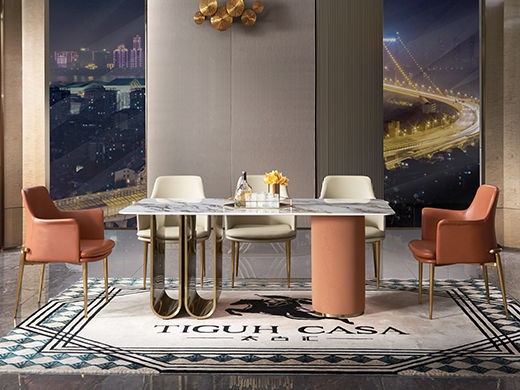 拜洛迪 轻奢 装饰皮革+拉丝香槟金不锈钢+磨砂岩板 1.6米餐桌¥5874