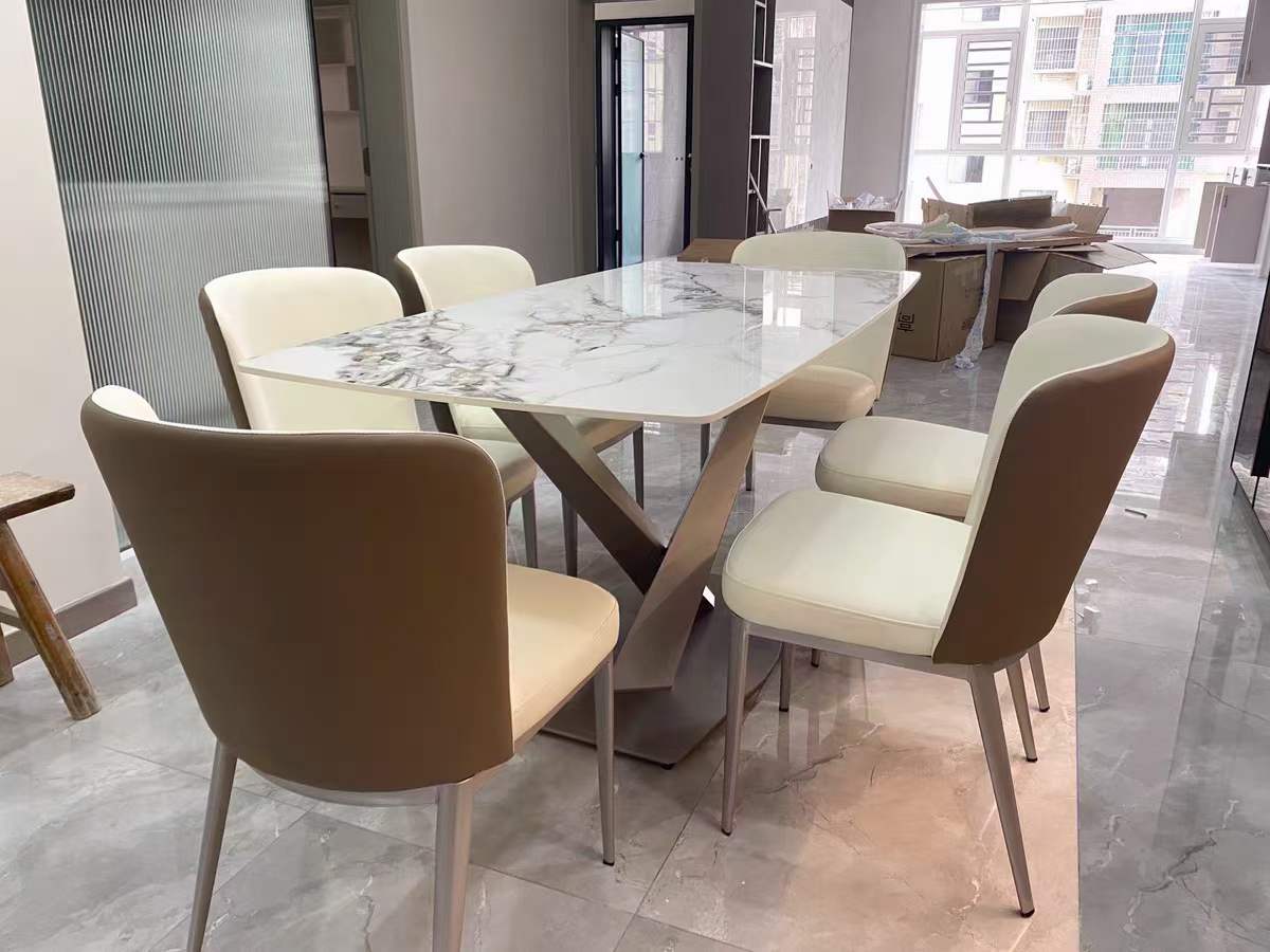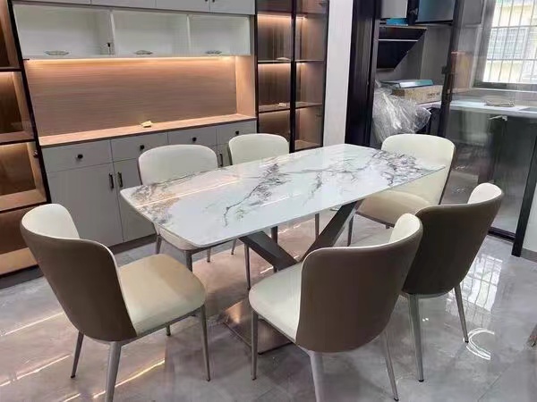 A系优选 现代简约 餐桌:莫兰紫碳素钢架+底板+亮光岩板餐椅:碳素钢+西皮+高密度海绵 1.4米餐桌+4椅 (含底板) |
