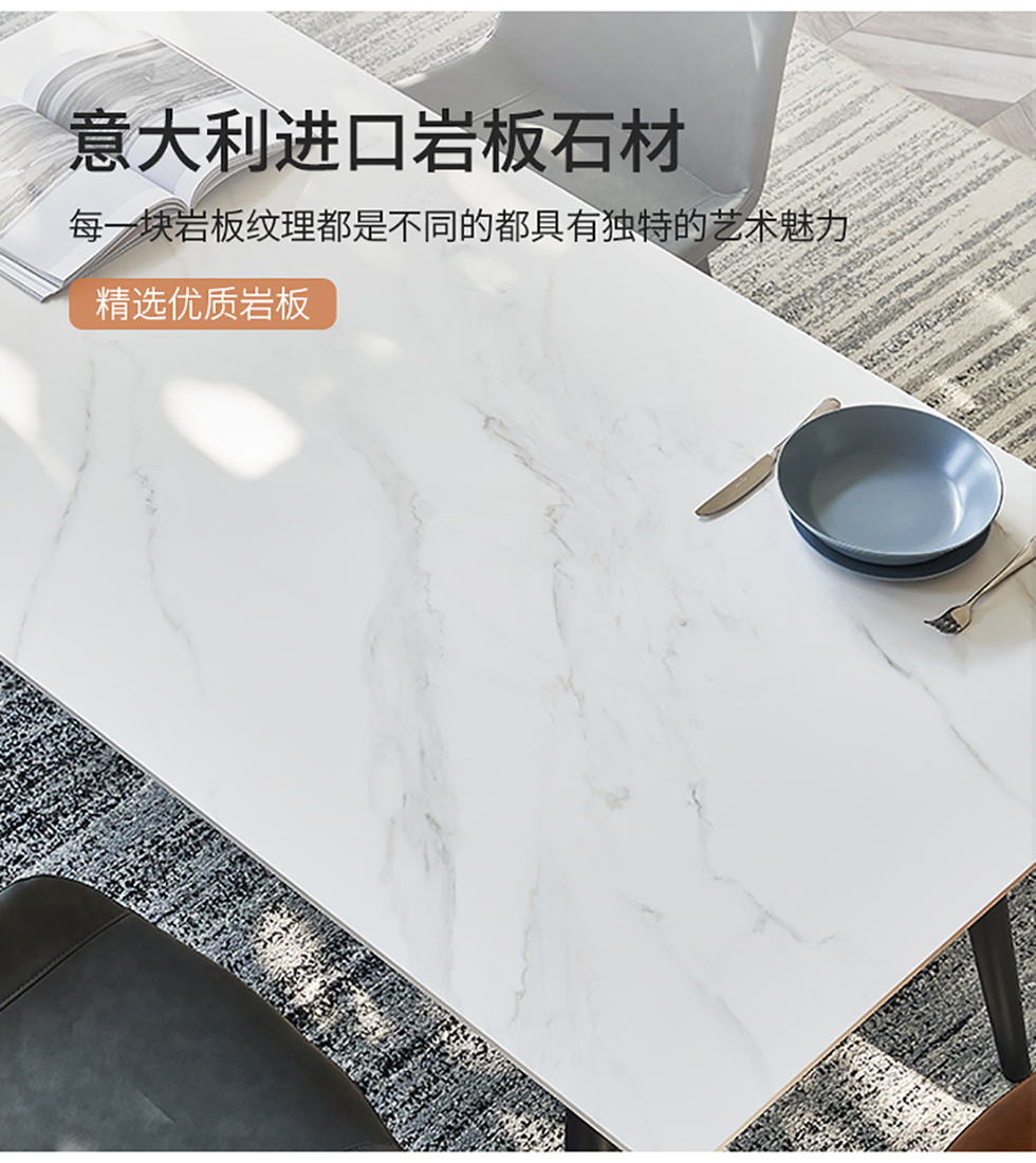 A系优选 现代简约 餐桌:碳素钢架+哑光岩板面+底板餐椅:马碳素钢+西皮+高密度海绵 1.4米餐桌+4椅 (含底板)¥3402