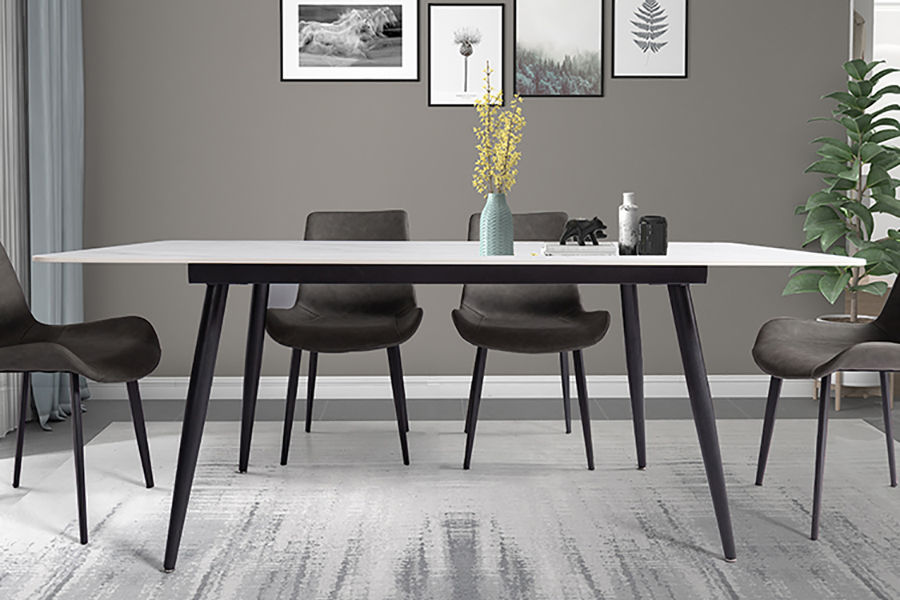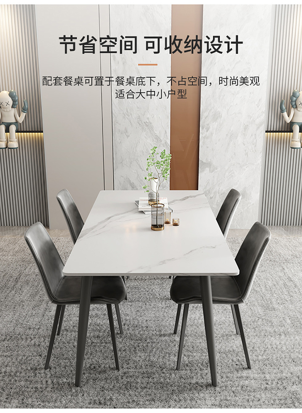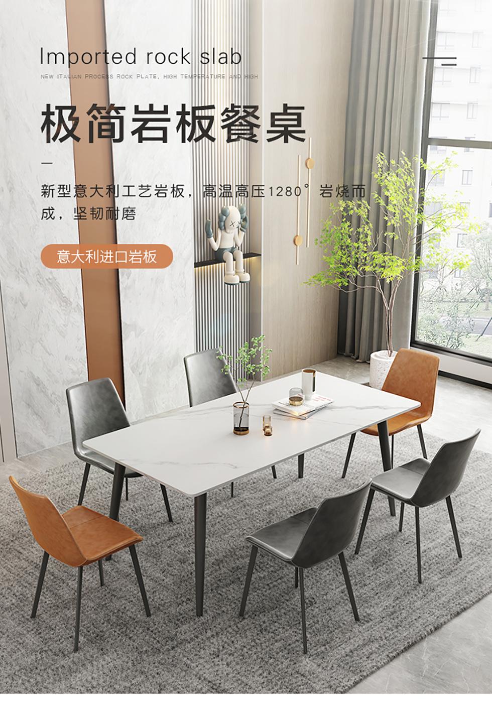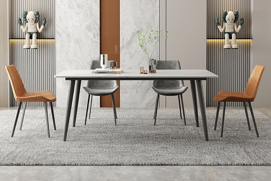 A系优选 现代简约 餐桌:岩板+碳素钢脚架 餐椅:碳素钢脚架+PU皮 1.4米餐桌+4把餐椅 (含底板)