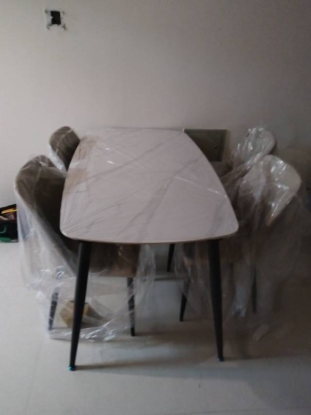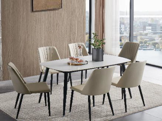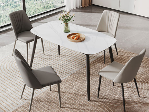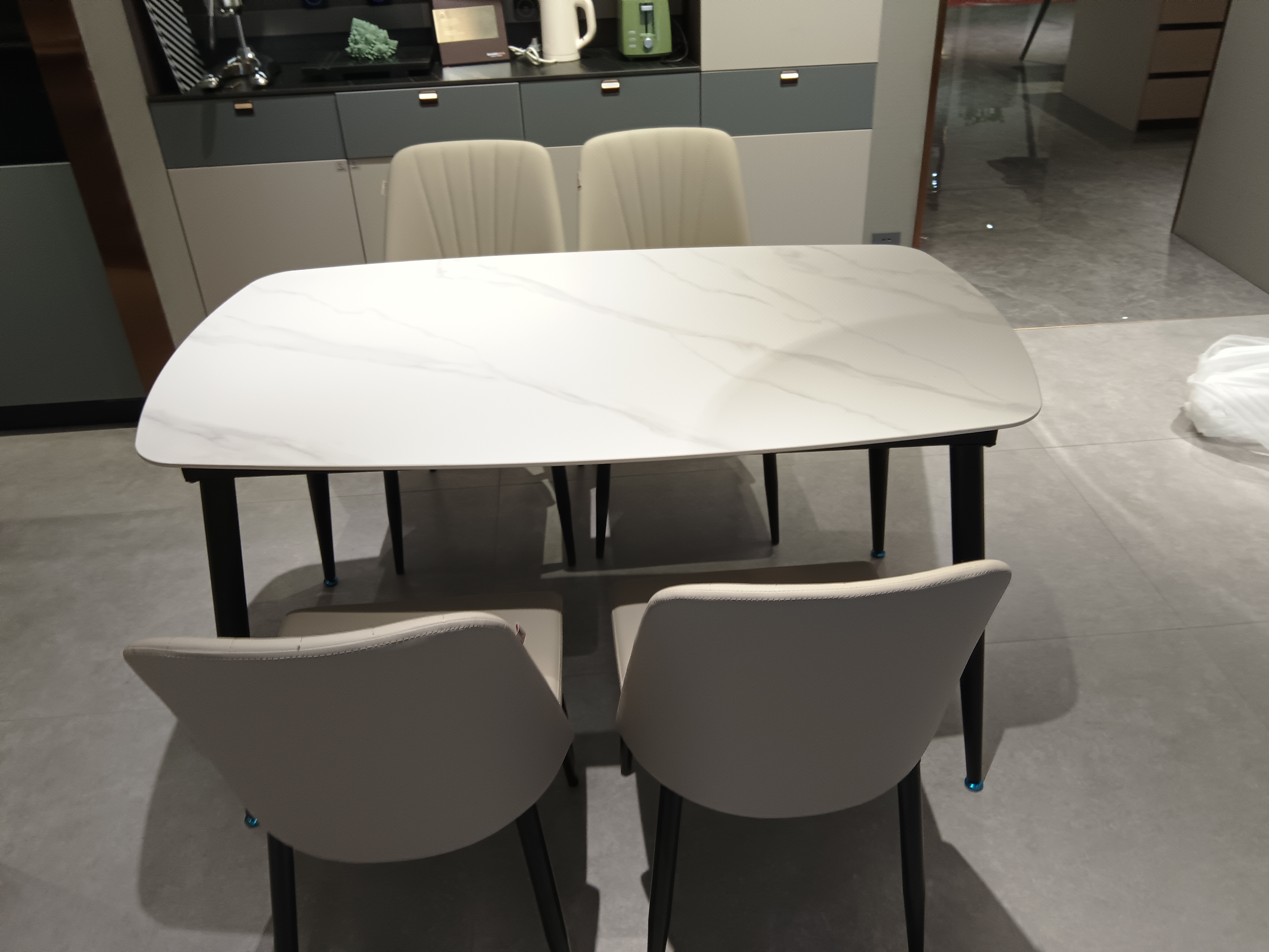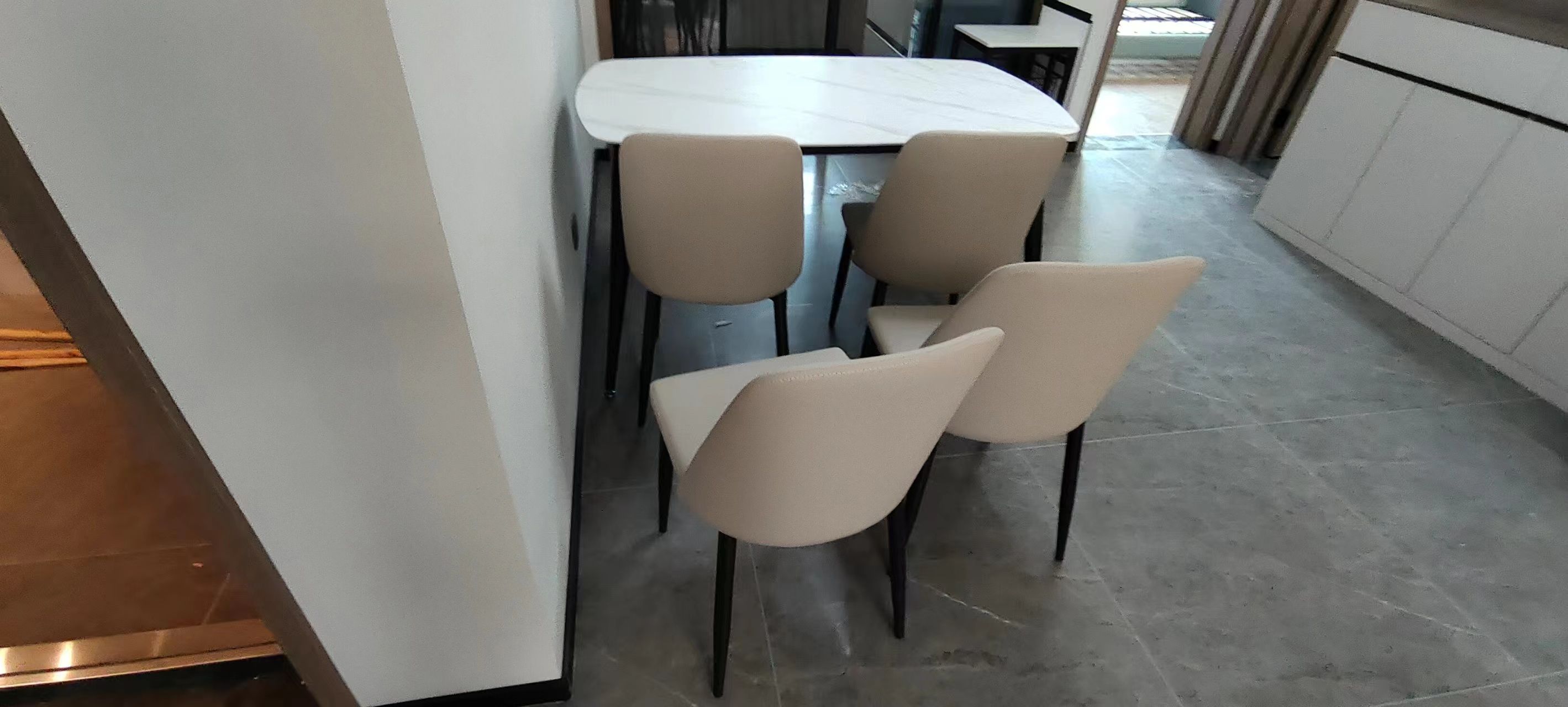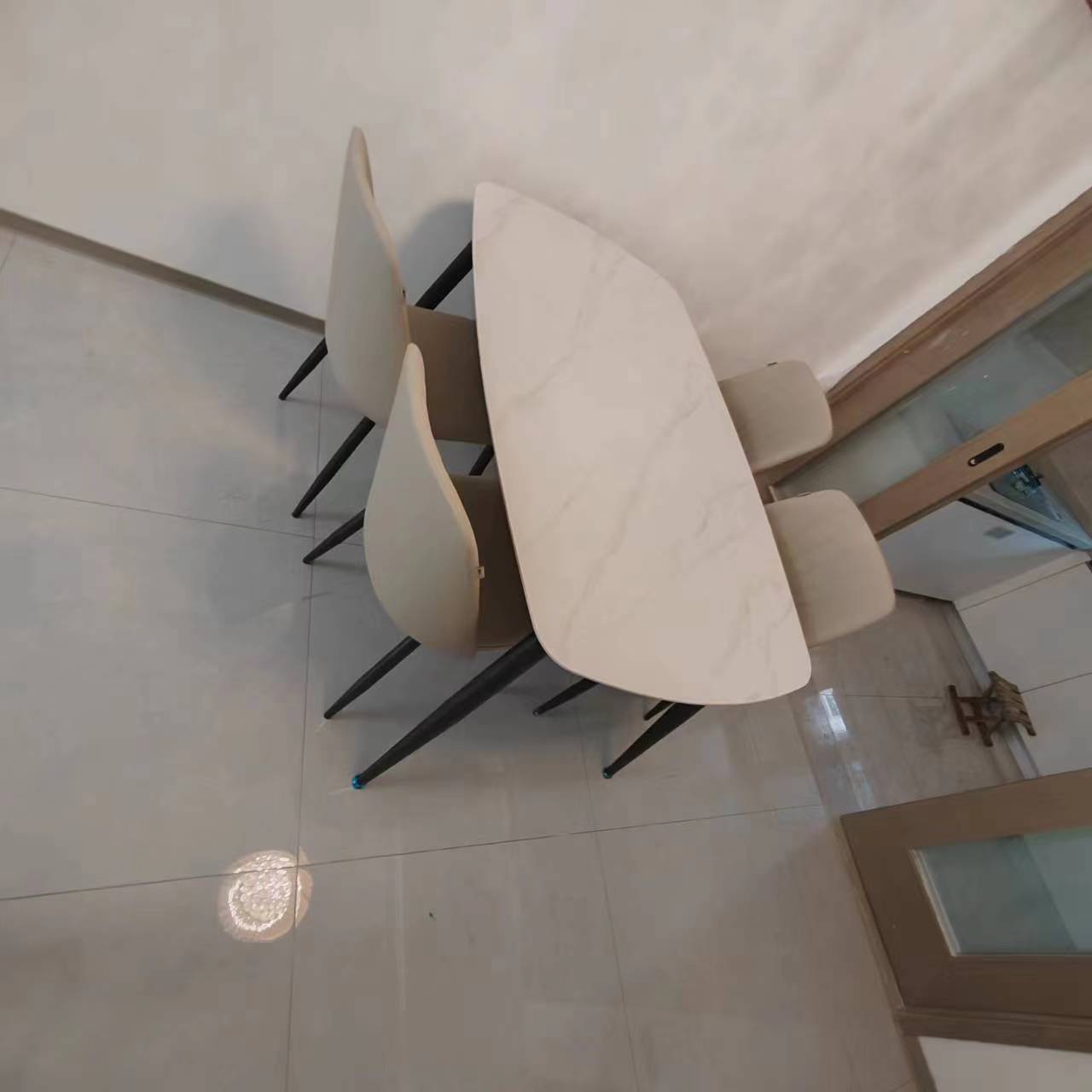 B系优选 现代简约 餐桌:12mm亮光奶油色岩板面+高密度板+烤漆+不锈钢脚 餐椅:铁艺框架+西皮靠背 1.4米餐桌+4把餐椅(含底板)¥2330