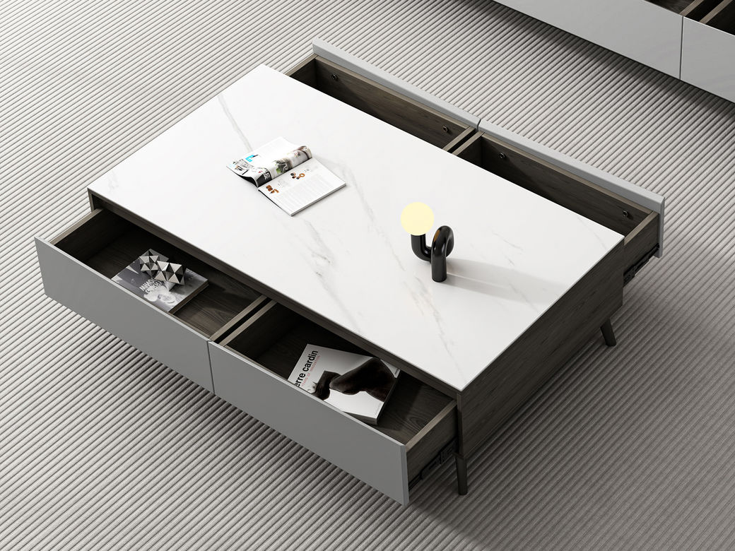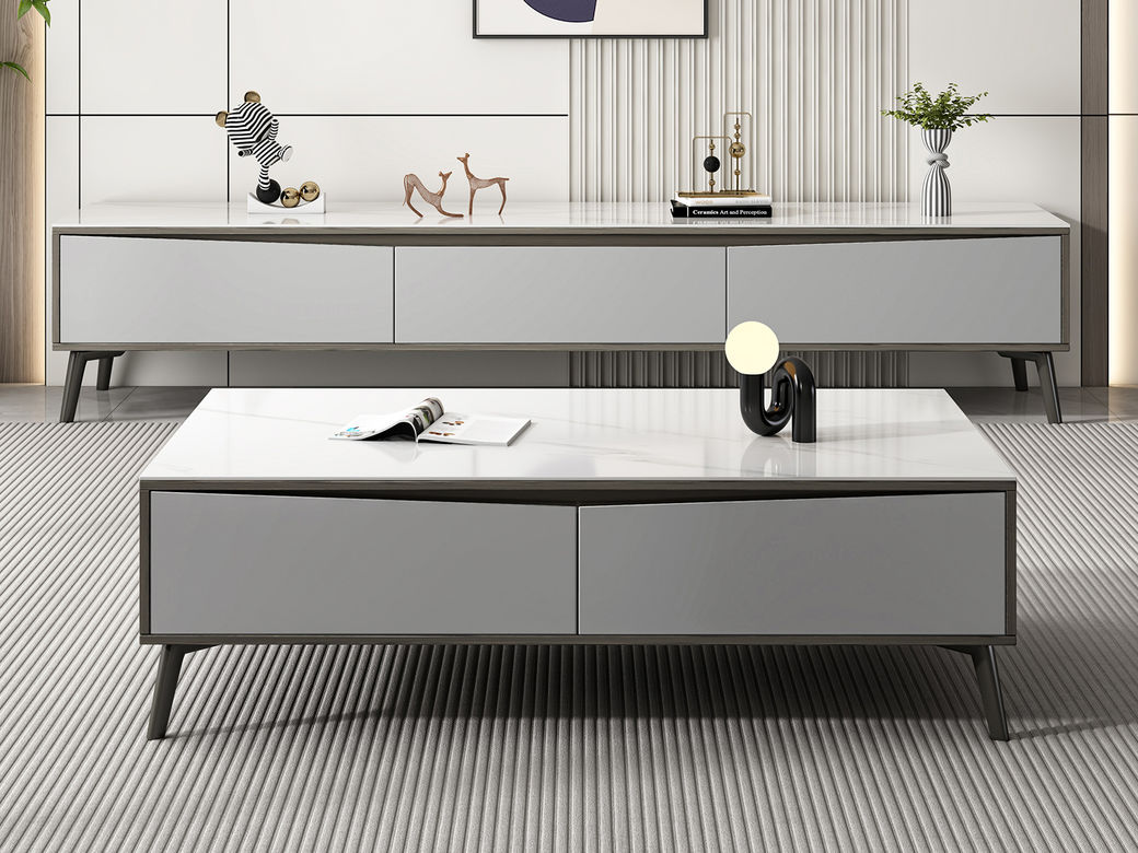 【套餐专享价】每屋优享系列 现代简约 柜体:高光玉灰色 托底缓冲导轨 岩板+PVC环保覆膜工艺 香奈儿 1.25米茶几¥1631
