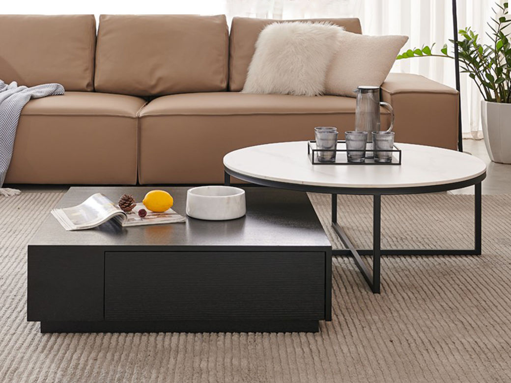 逸澜斯 极简 方几:原木夹板柜体+原木夹板抽屉+原木夹板脚/圆边几:岩板配碳素钢脚 0.9米组合茶几