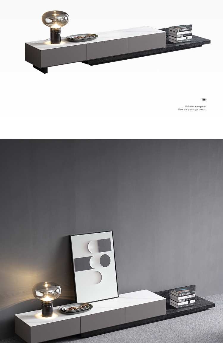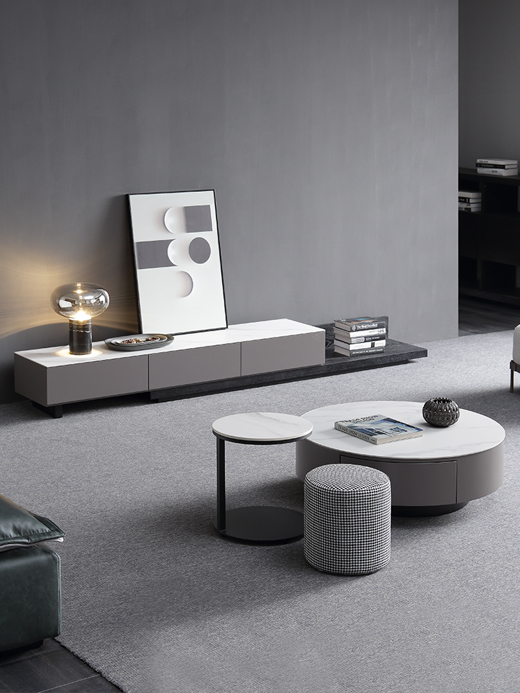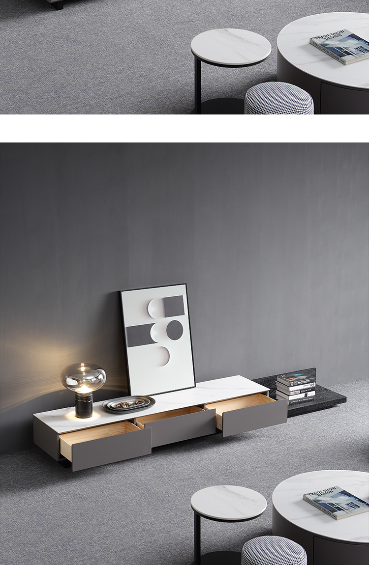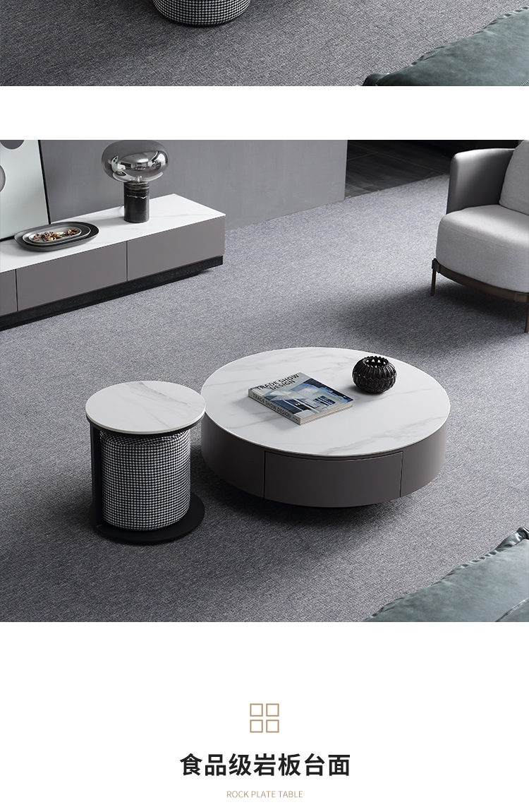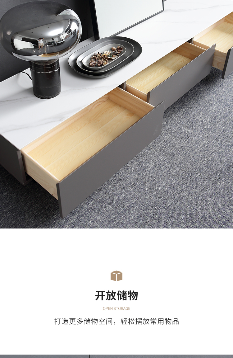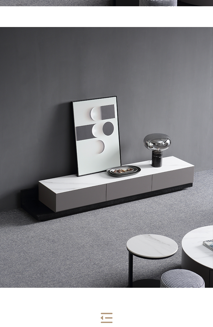 B系优选 现代简约 亮光岩板+亮光烤漆柜子 钛金五金底架+实木抽屉 卡其色 1.3米茶几¥2330