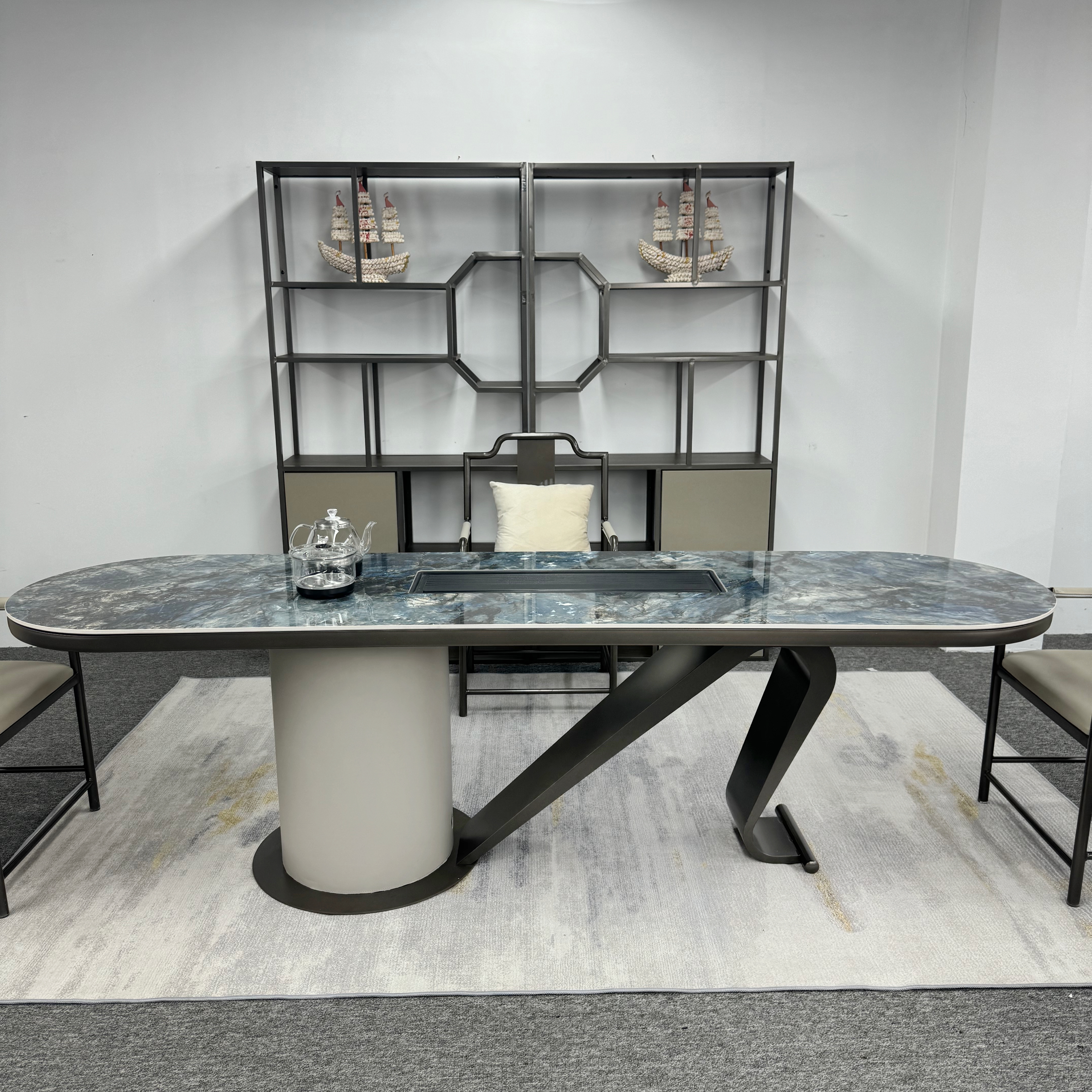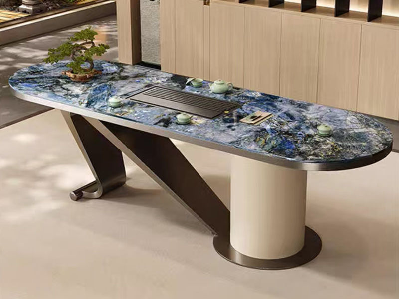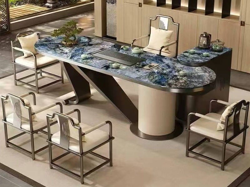 上铭轩 轻奢 蓝宝石岩板+碳素钢五金+仿真皮+电茶炉+茶车(不含椅子茶具) 2米岛台 茶台