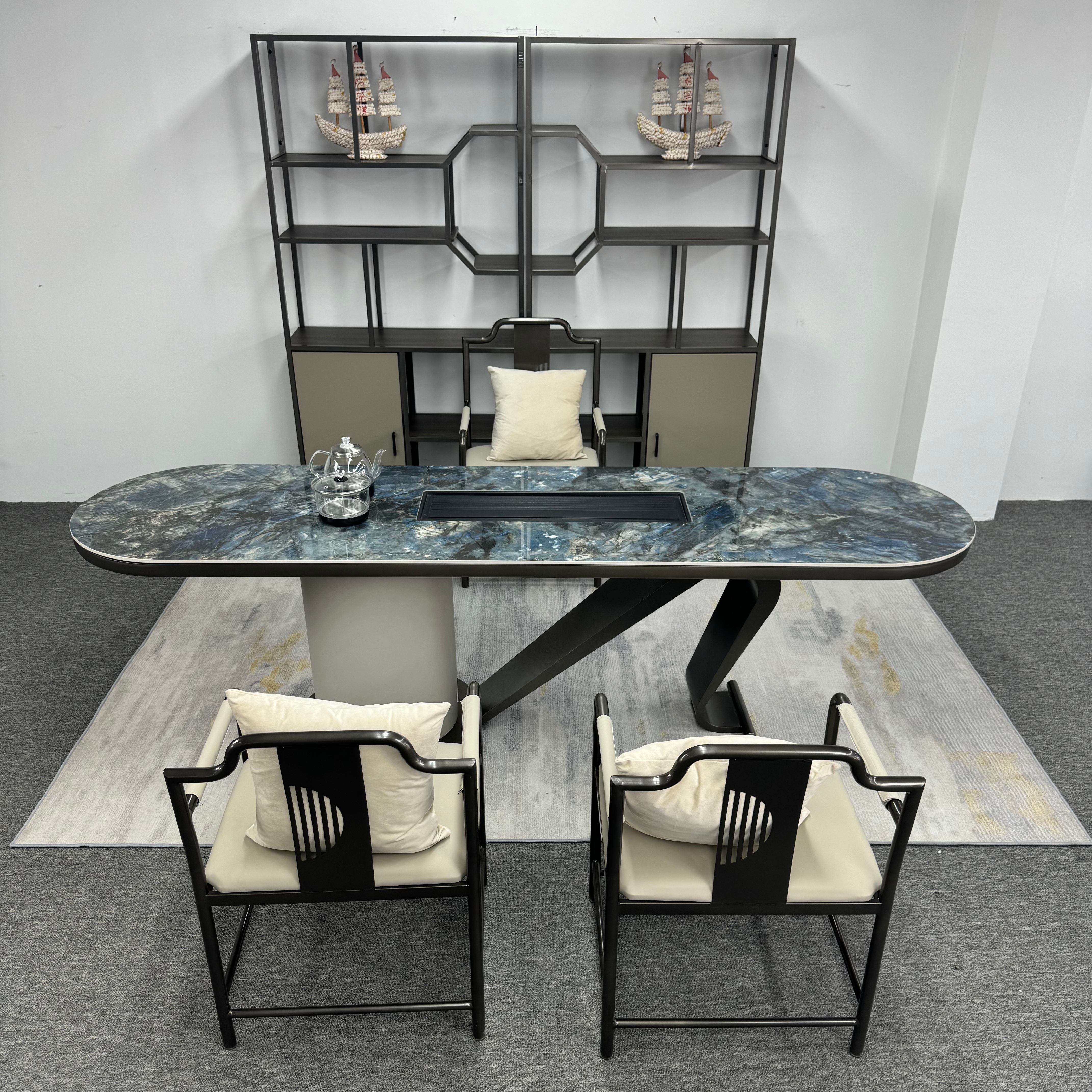 上铭轩 轻奢 香奈儿岩板+E1中纤板+碳素钢五金+电茶炉+一桌三椅 1.8米茶书桌¥5645