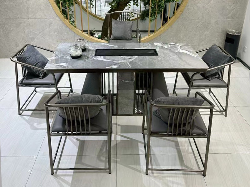 上铭轩 轻奢 摩洛哥岩板+碳素钢五金+高回弹海绵+仿真皮+电茶炉+一桌五椅(不含茶具) 1.8米岛台 茶台