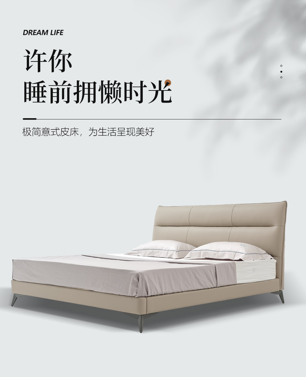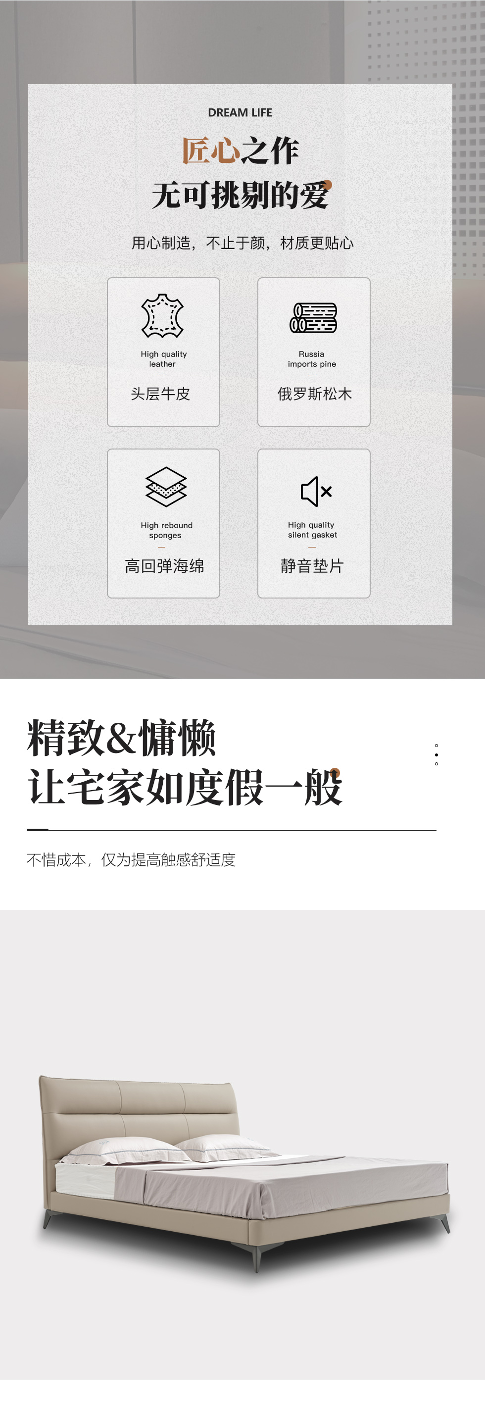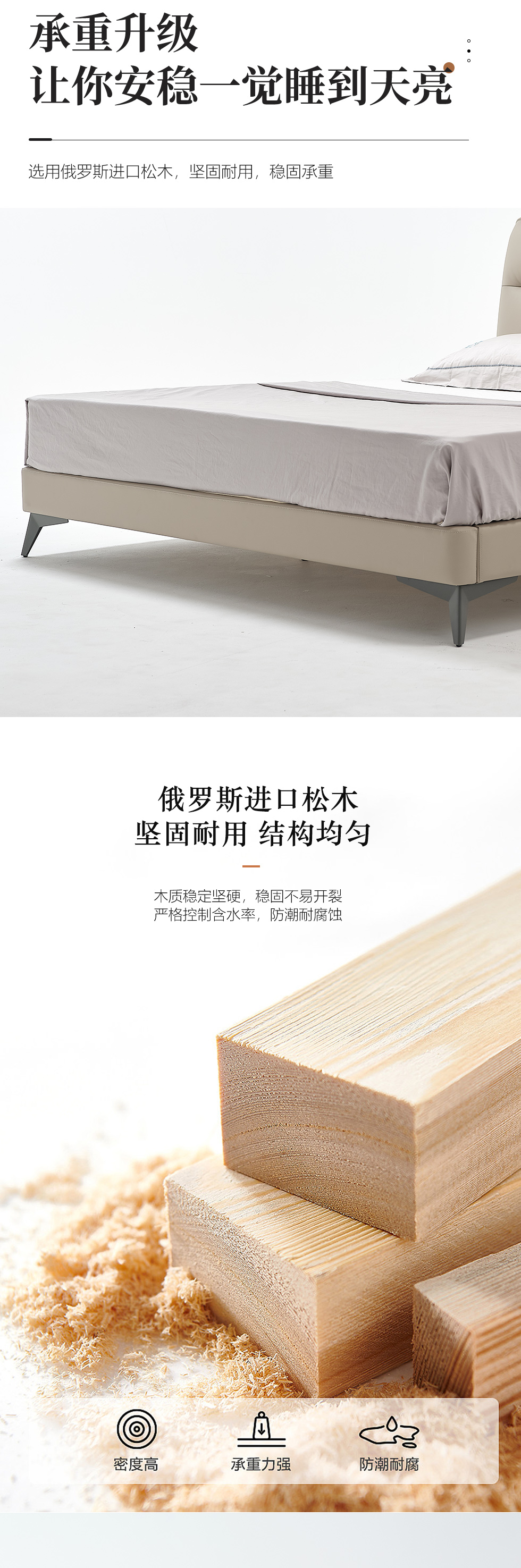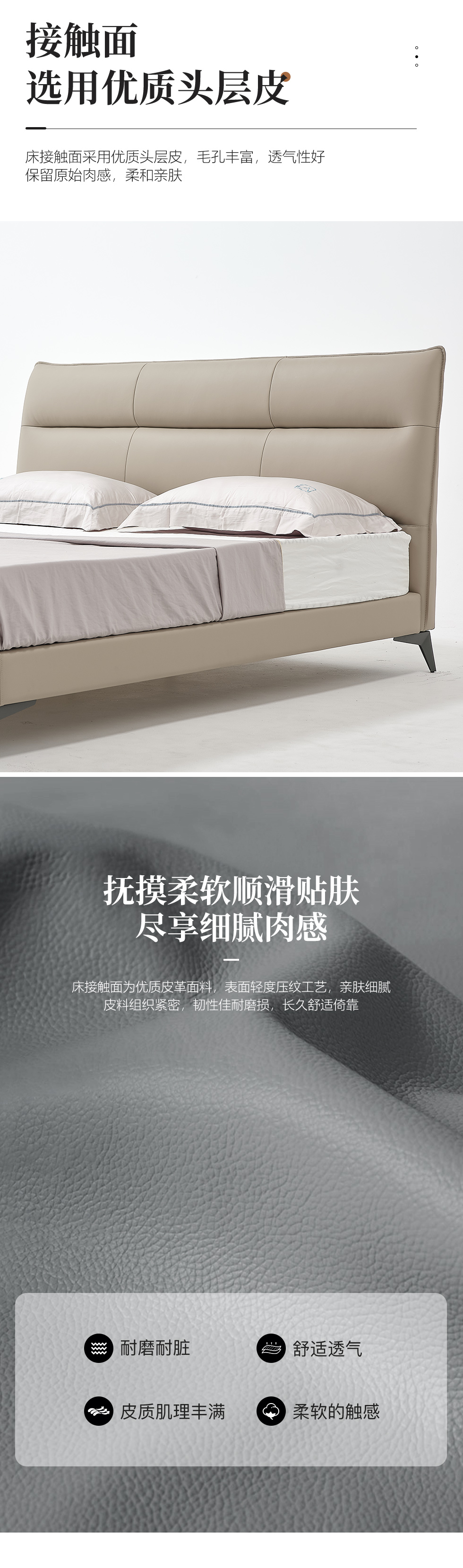 希奥 极简 接触面真皮+PVC+床架俄罗斯进口松木+多层实木板+E1密度板+多层实木板 浅灰色1.8米皮床