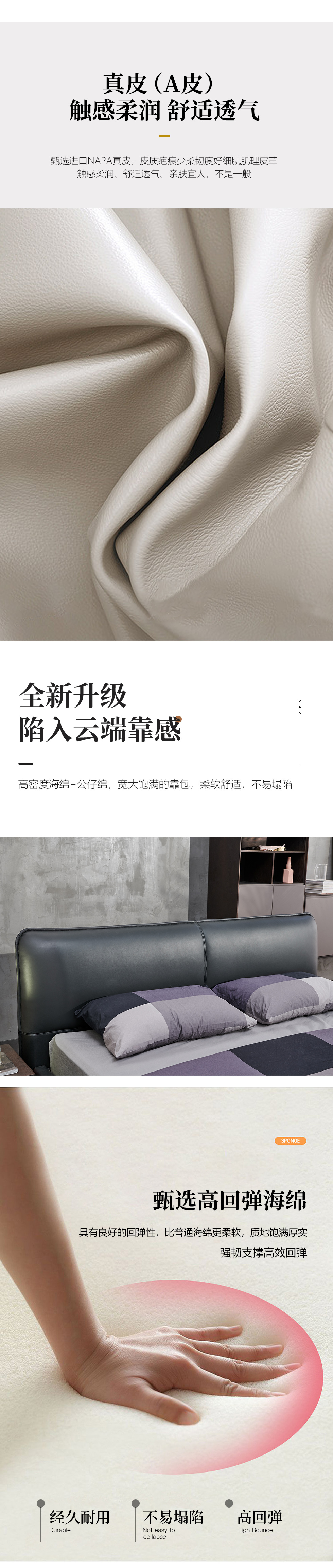 洛萨 现代极简 俄罗斯进口木方 +高回弹海绵+接触面进口头层牛皮+钢木宽排排骨架 软床¥4552