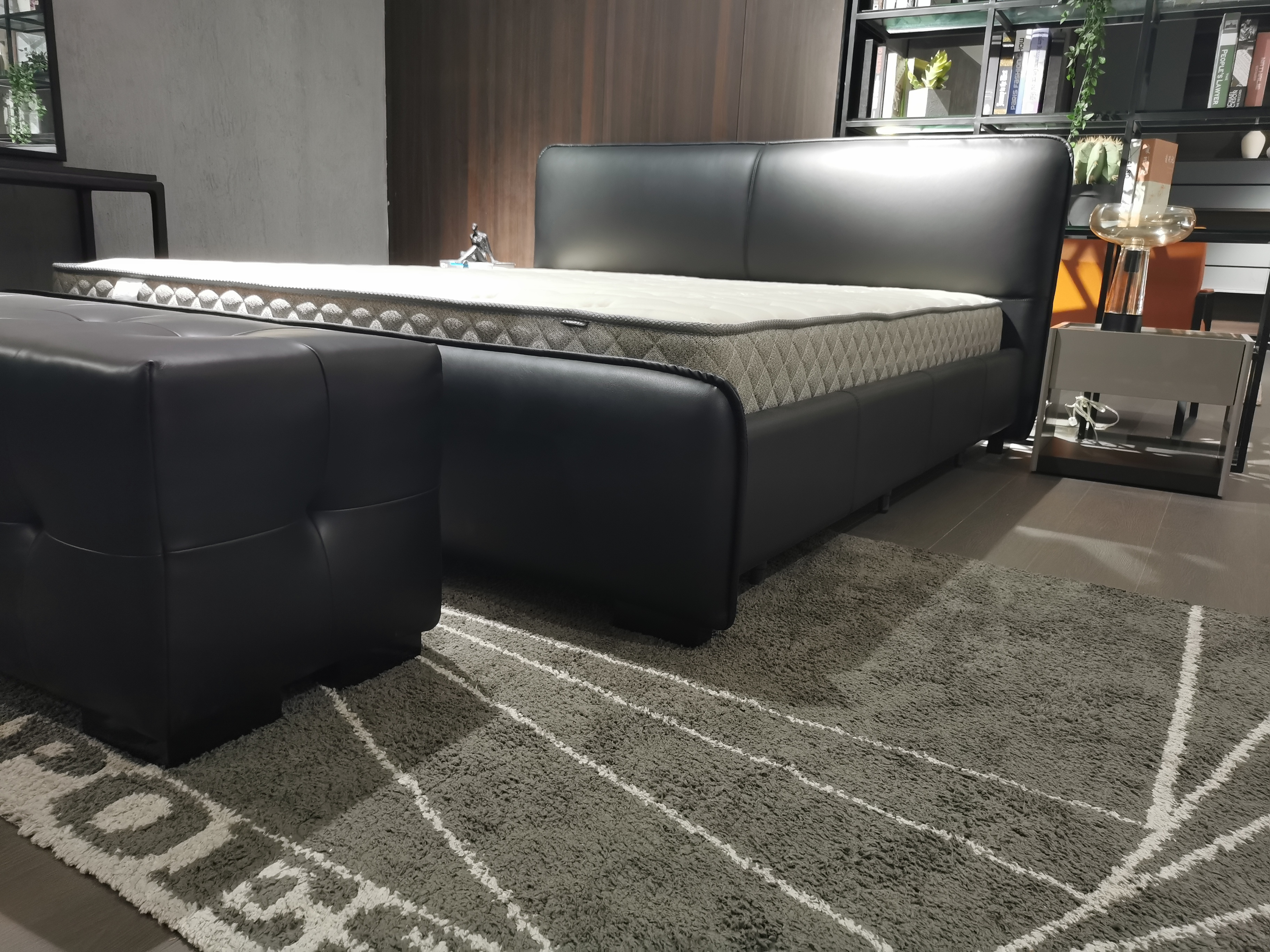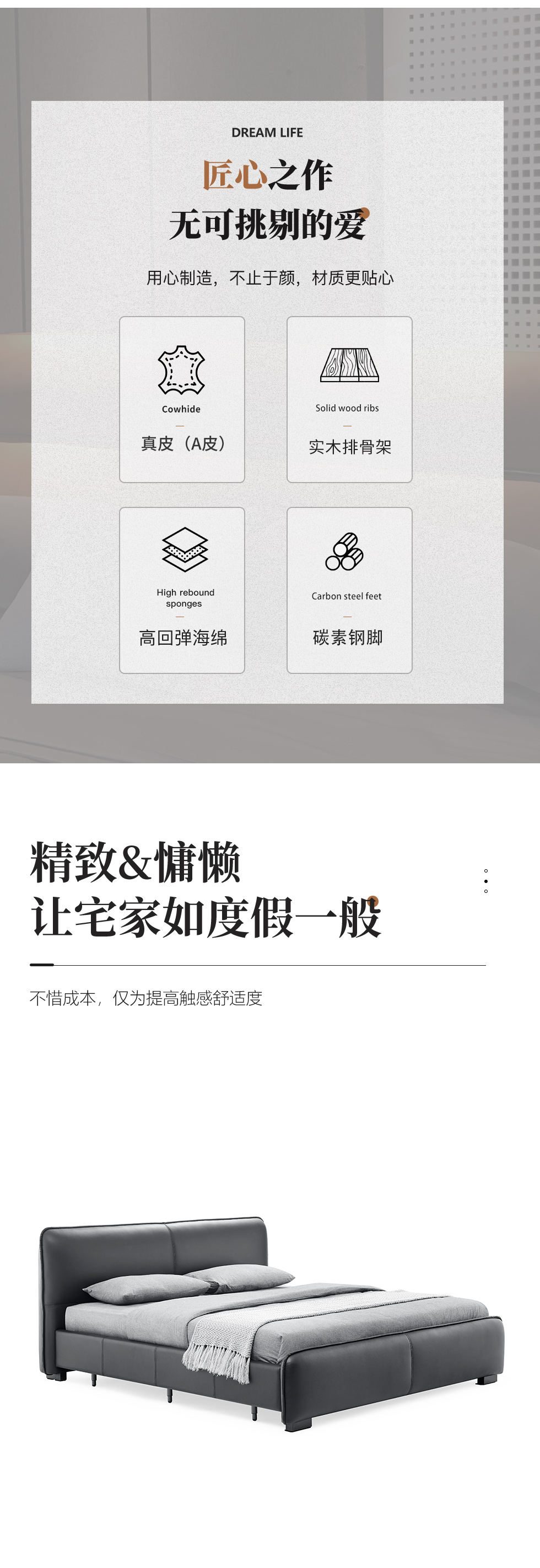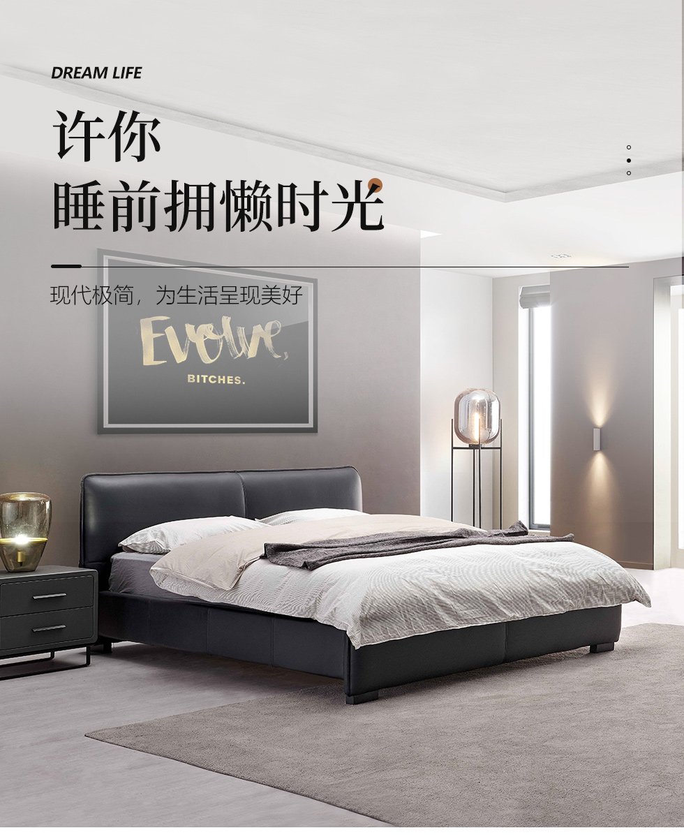 Milos米洛斯 极简 接触面真皮(A皮)+高密度海绵+实木床侧+实木排骨架+碳素钢金属烤漆脚 1.8m床 |