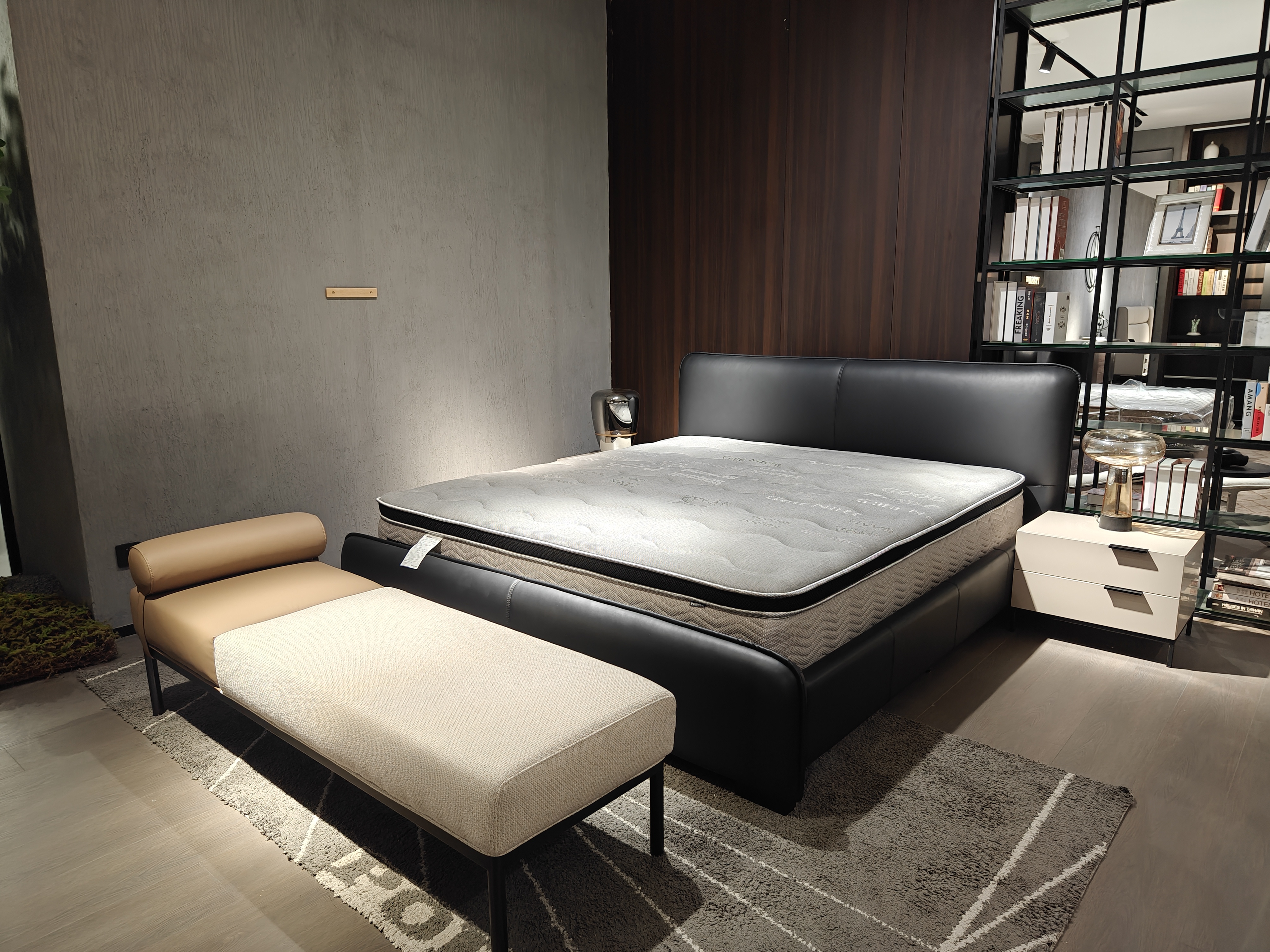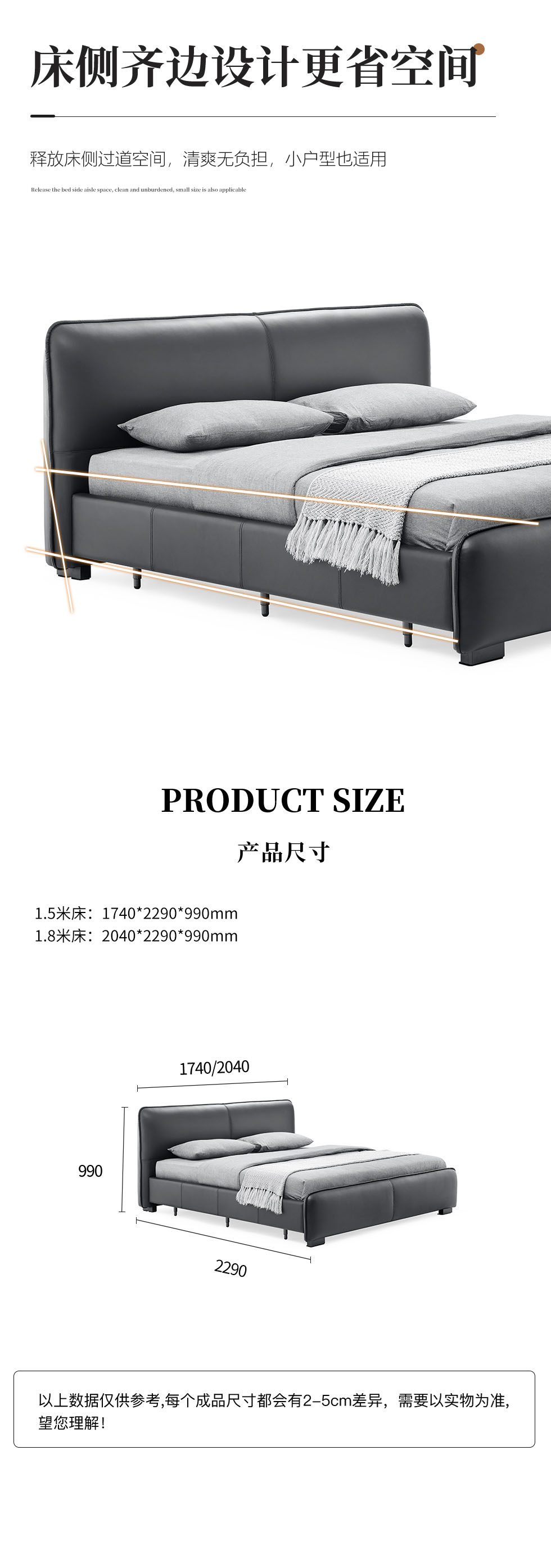 CBD家居 极简 接触面真皮+非接触面仿皮+东亚海绵+云杉木实木主框架+分体卷帘式排骨条 TE97镍灰 1.8米床架¥15839
