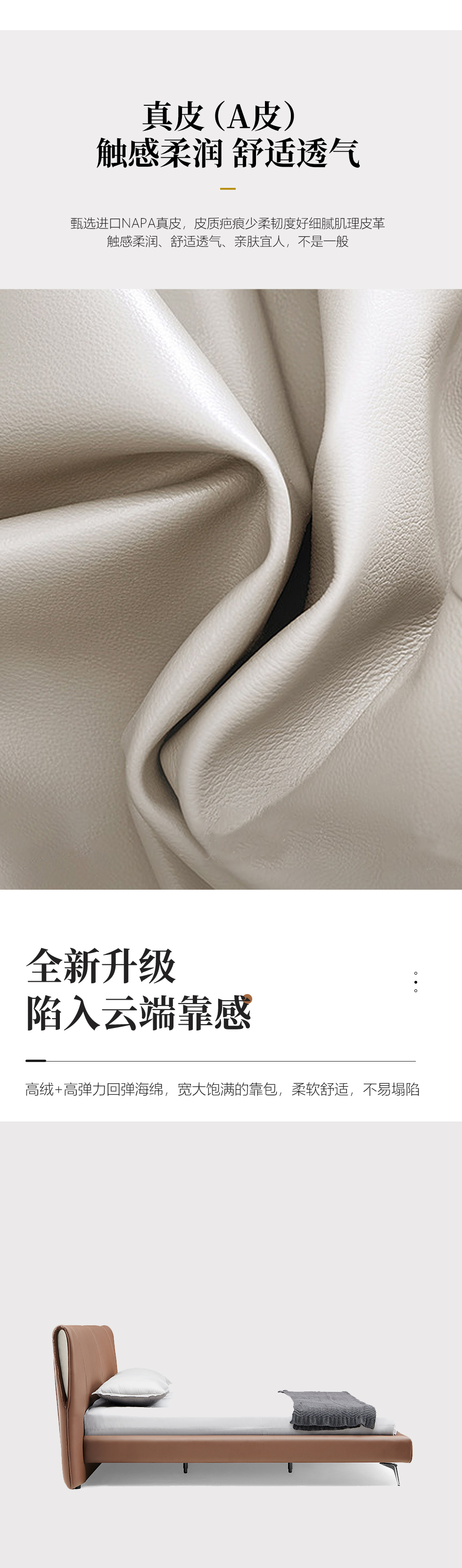 洛萨 极简 接触面真皮 进口松木内架 高回弹海绵 静音床板 意式拉点床 1.8米床