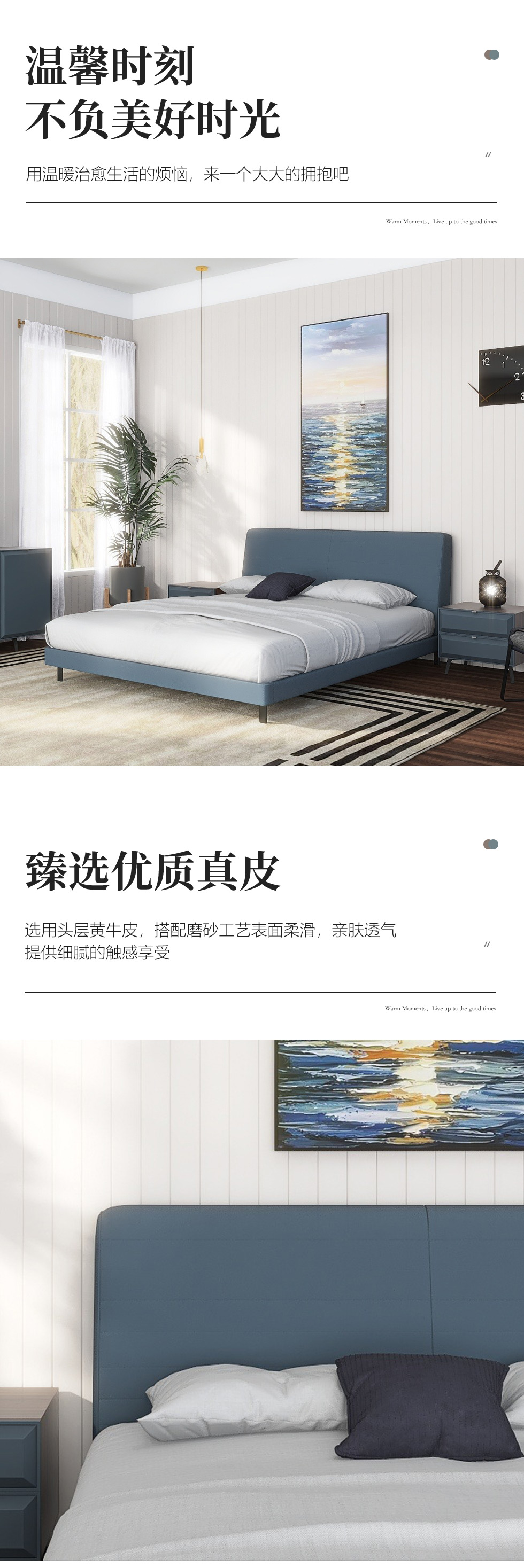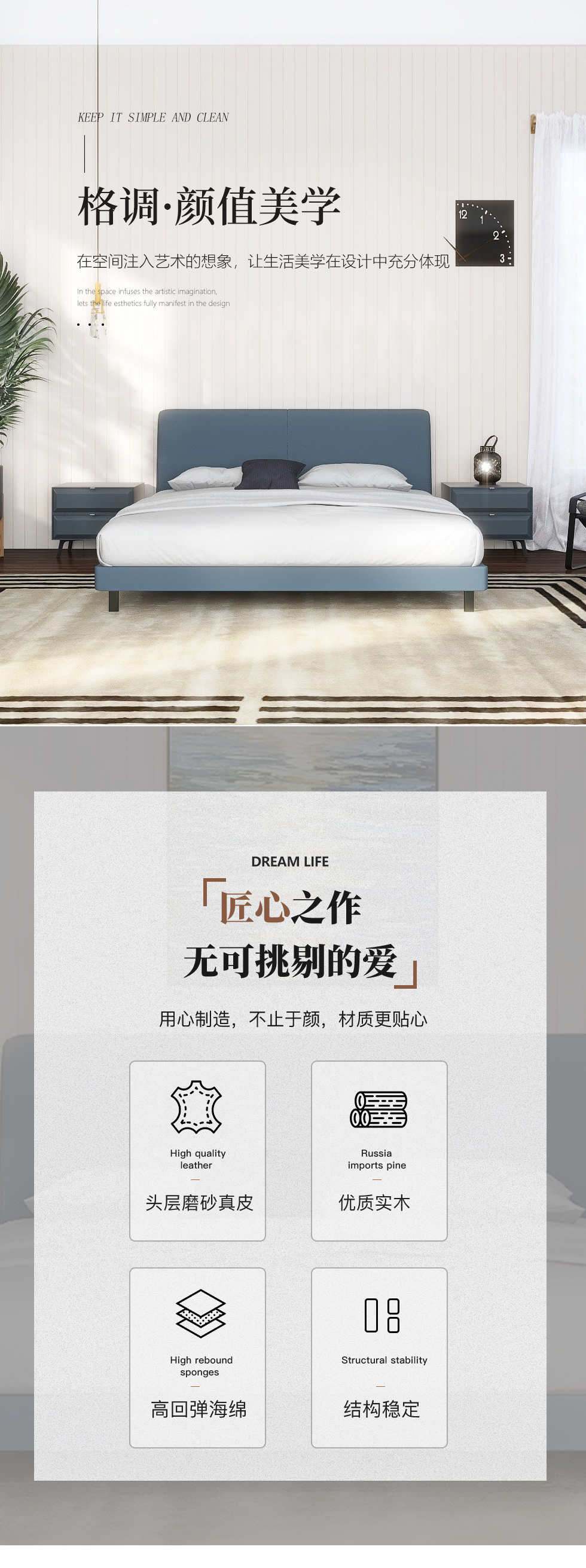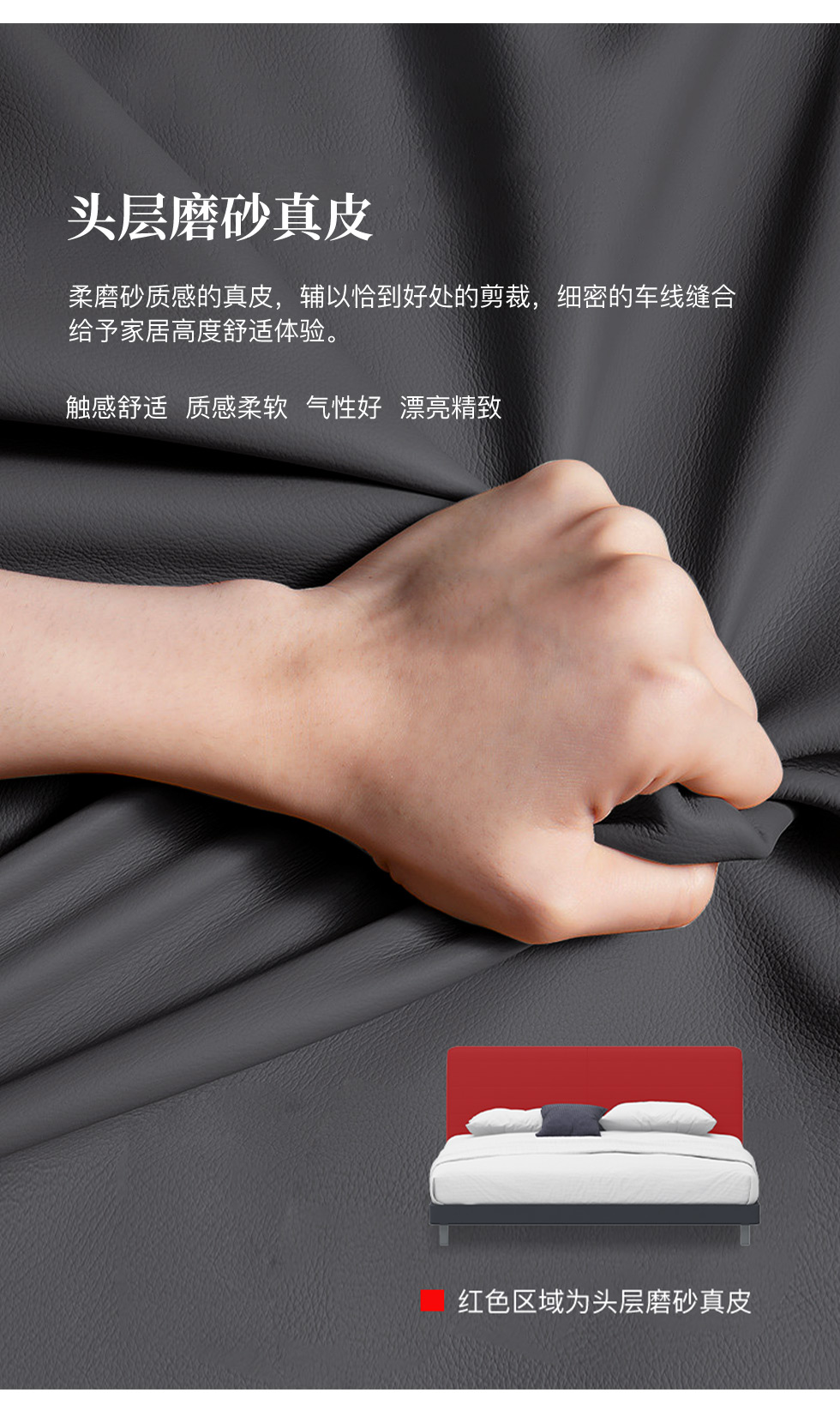 缔造 极简 接触面头层磨砂真皮+高密度海棉+不锈钢脚+实木排骨架 1.5米皮床