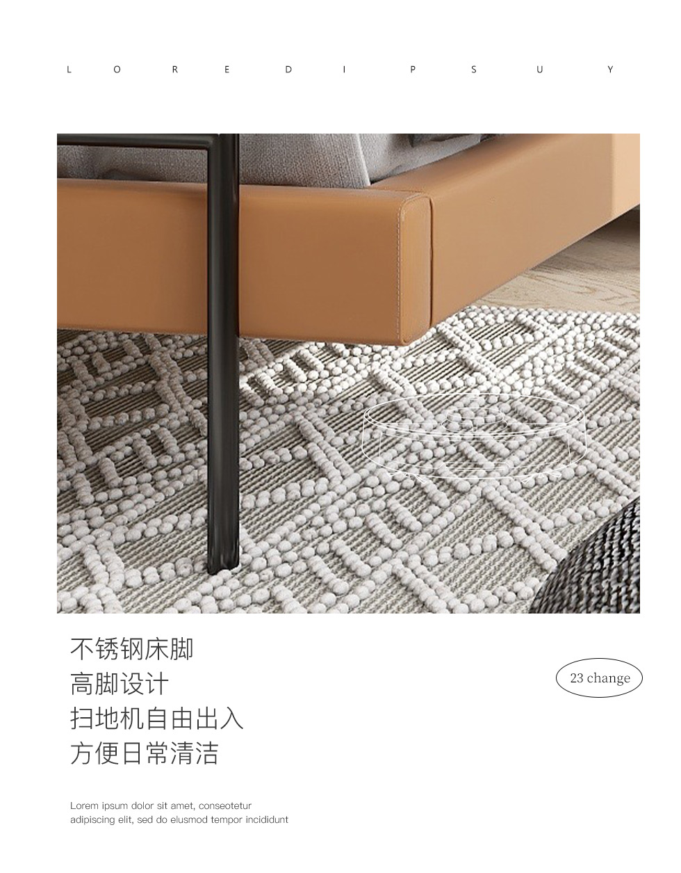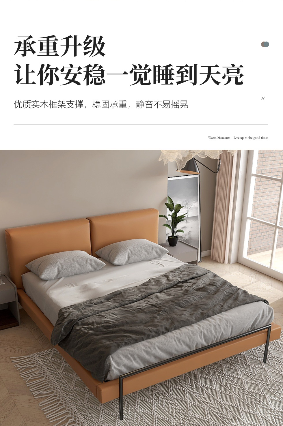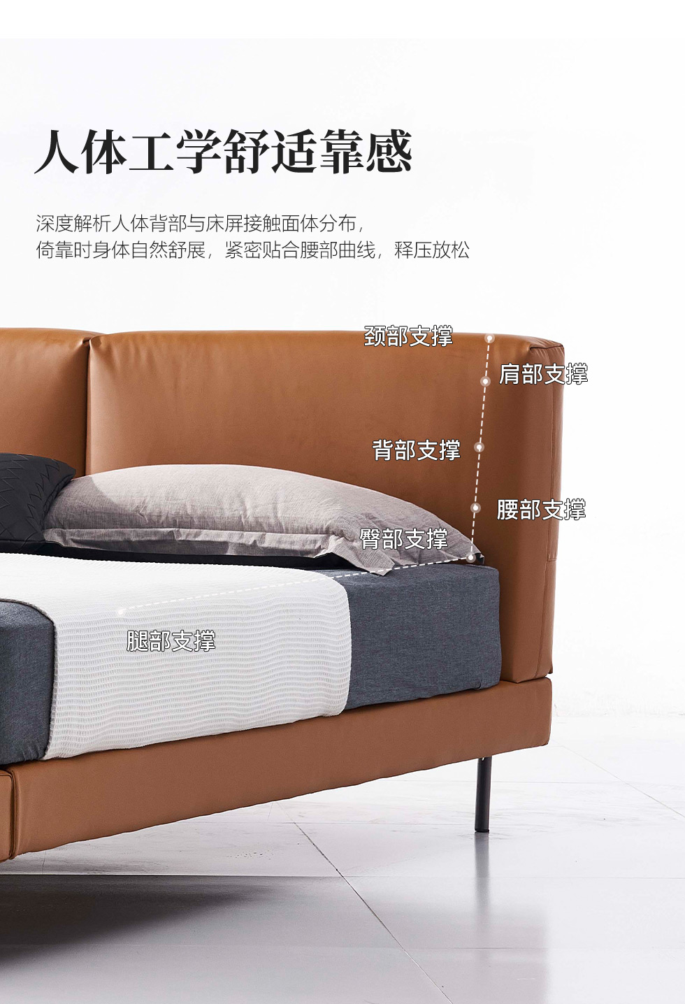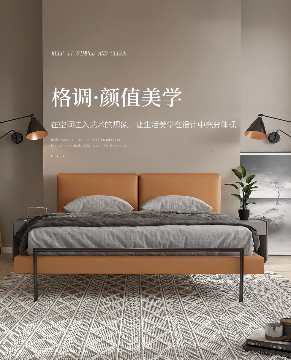 缔造 极简 接触面头层磨砂真皮+高密度海棉+不锈钢脚+实木排骨架 1.8米皮床