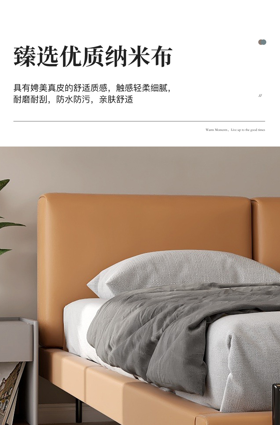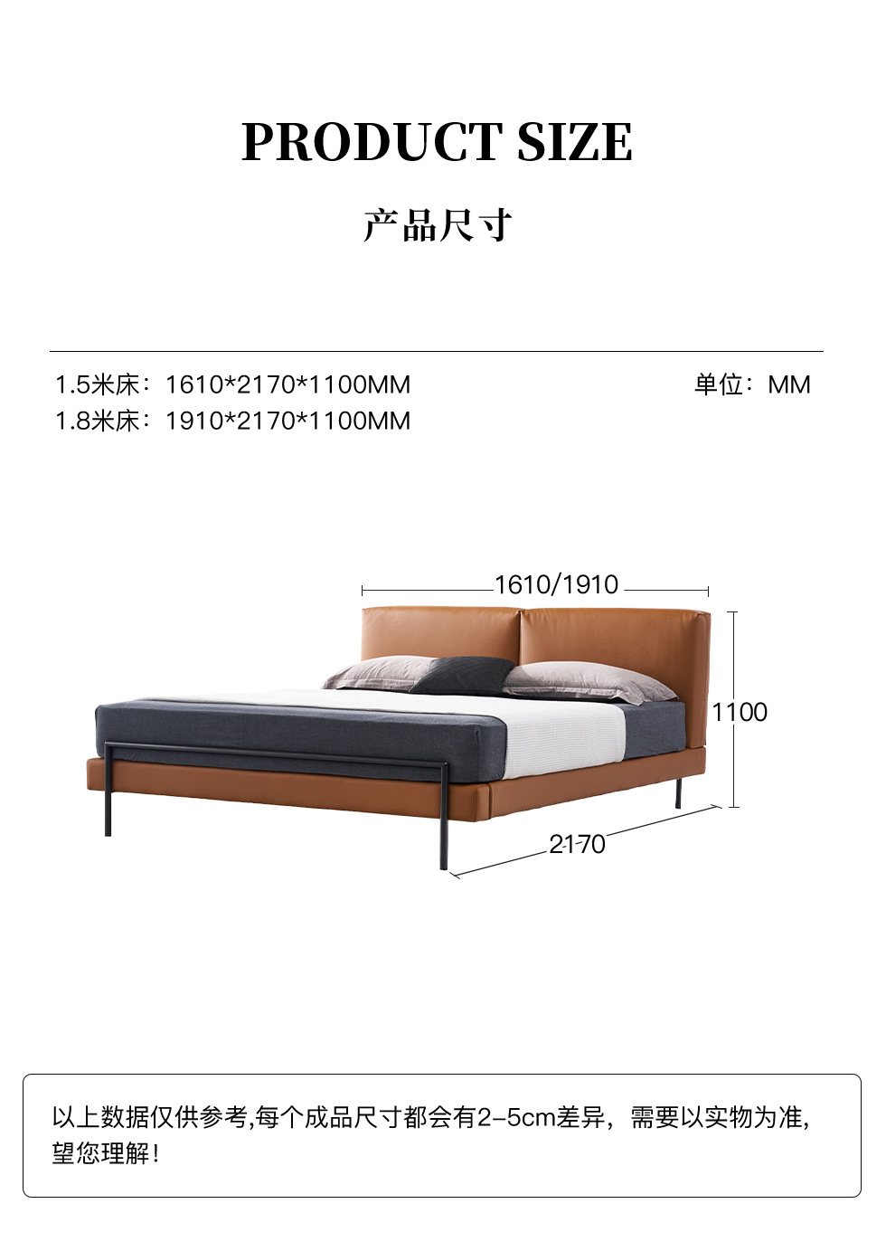 缔造 极简 接触面头层纳帕真皮+实木排骨架+羽丝棉+高密度海棉+碳素钢脚 1.5米皮床