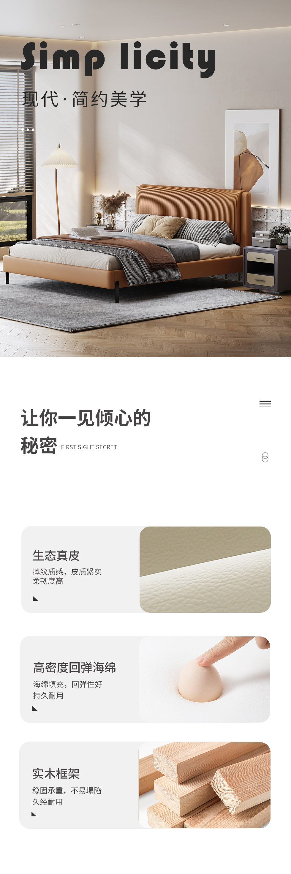 Minttu明途 极简 实木框架+海绵+生态真皮+仿皮+五金脚 皮床 1.8米| 商品详情 | 规格参数 | 评价(0) | 购买咨询() | 产品实拍图 |