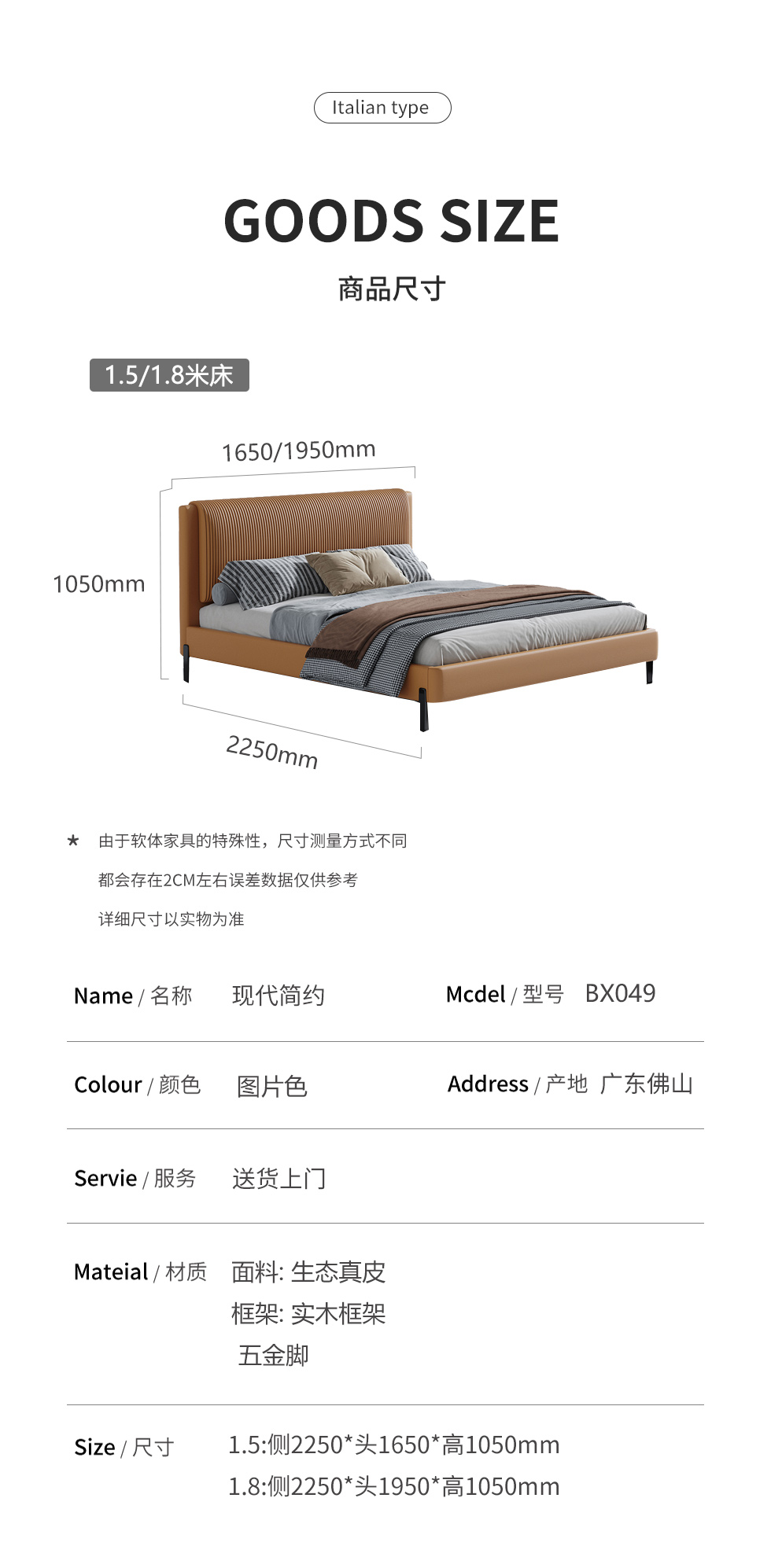 Minttu明途 极简 实木框架+海绵+生态真皮+仿皮+五金脚 皮床 1.8米