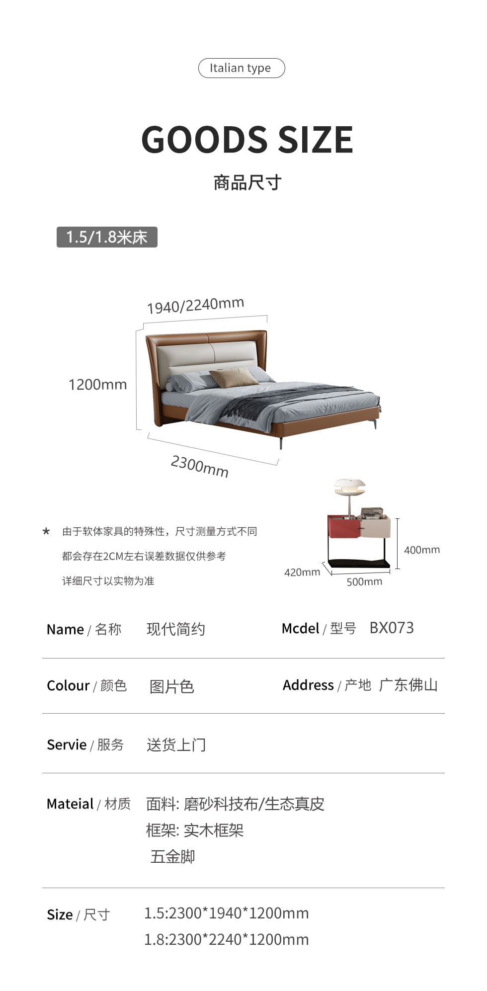 Minttu明途 极简 实木框架+海绵+生态真皮+仿皮+五金脚 皮床 1.8米+两个床头柜