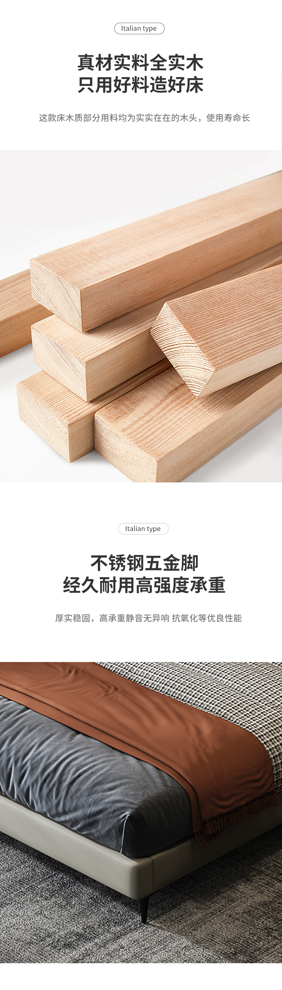 Minttu明途 极简 实木框架+高回弹海绵+全夹板床边+接触面真皮+仿皮+不锈钢五金脚 皮床 1.5米