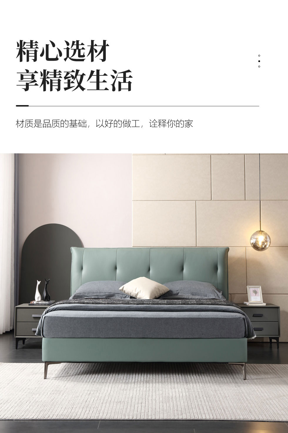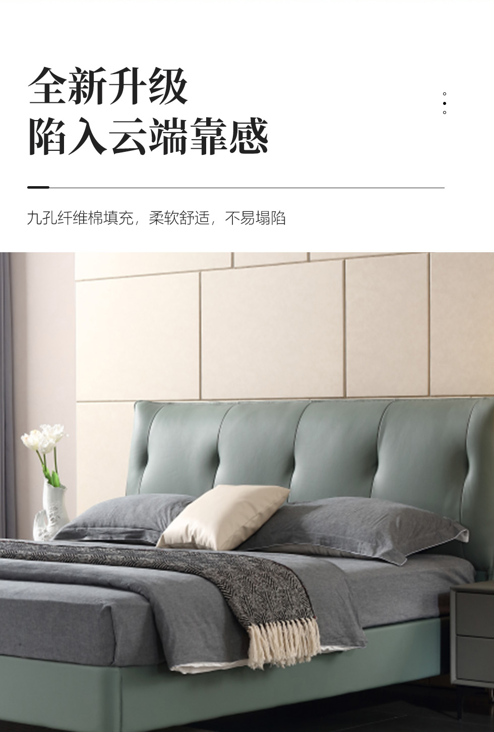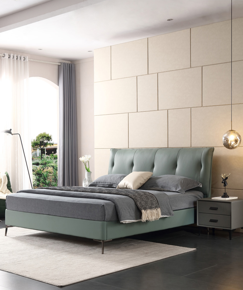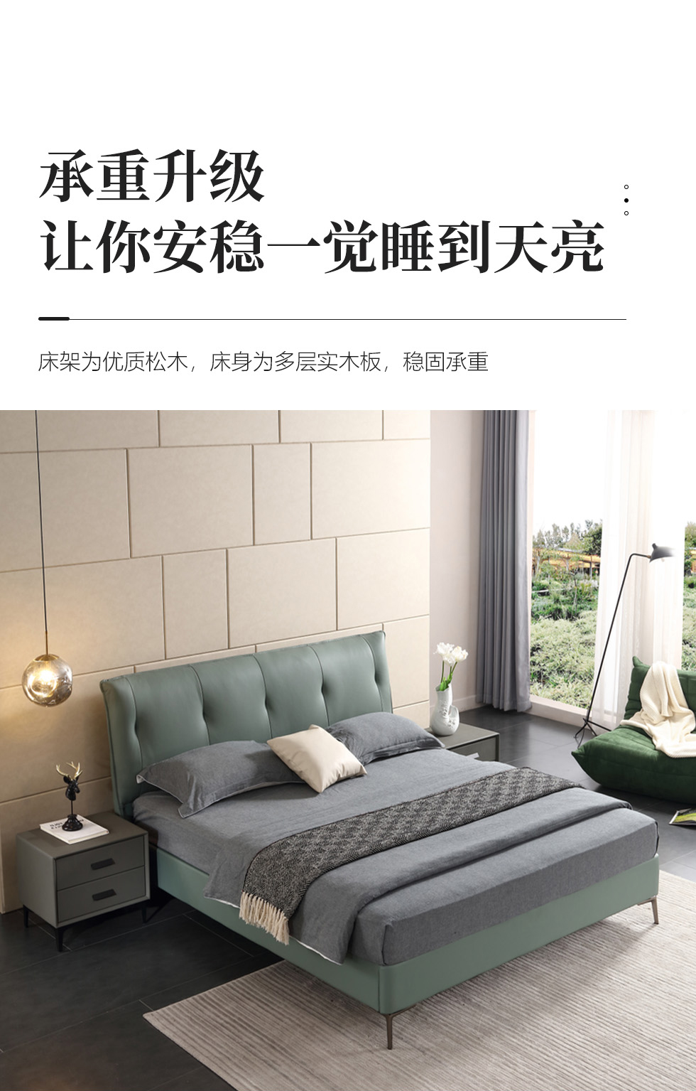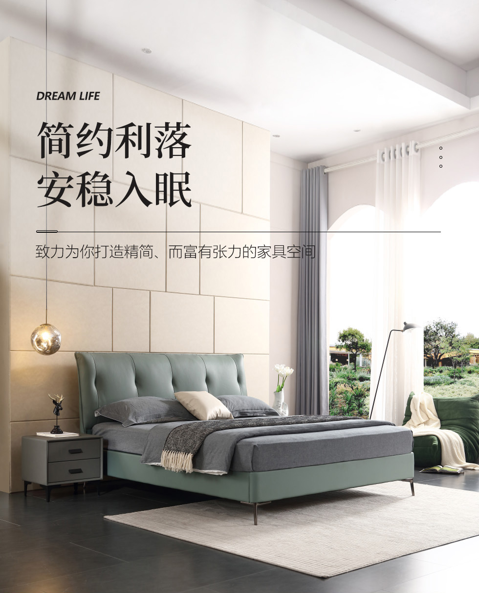 e家优选 极简 接触面靠包真皮 松木 实木多层板 九孔纤维棉 绿色 1.8米皮床¥3849