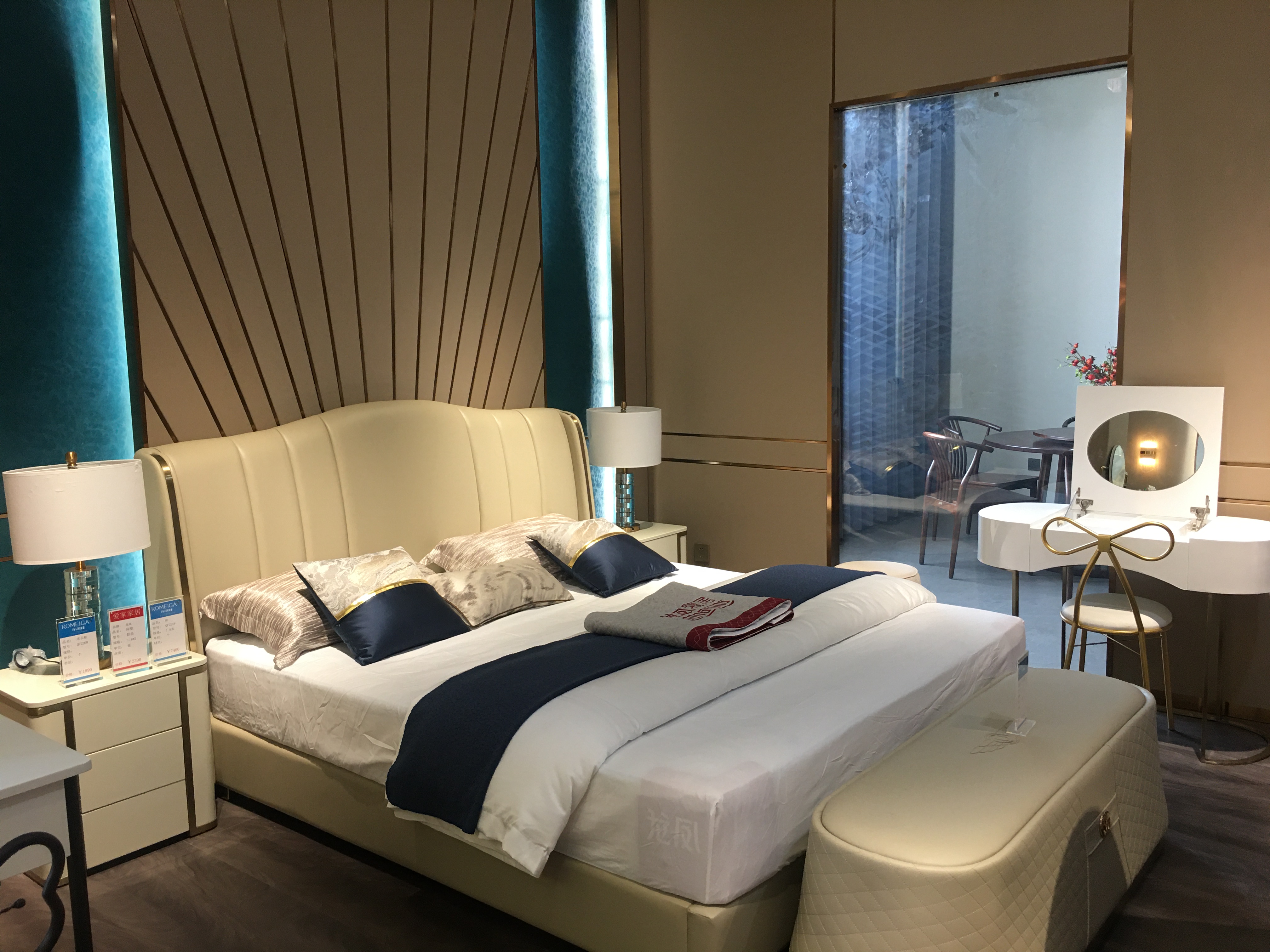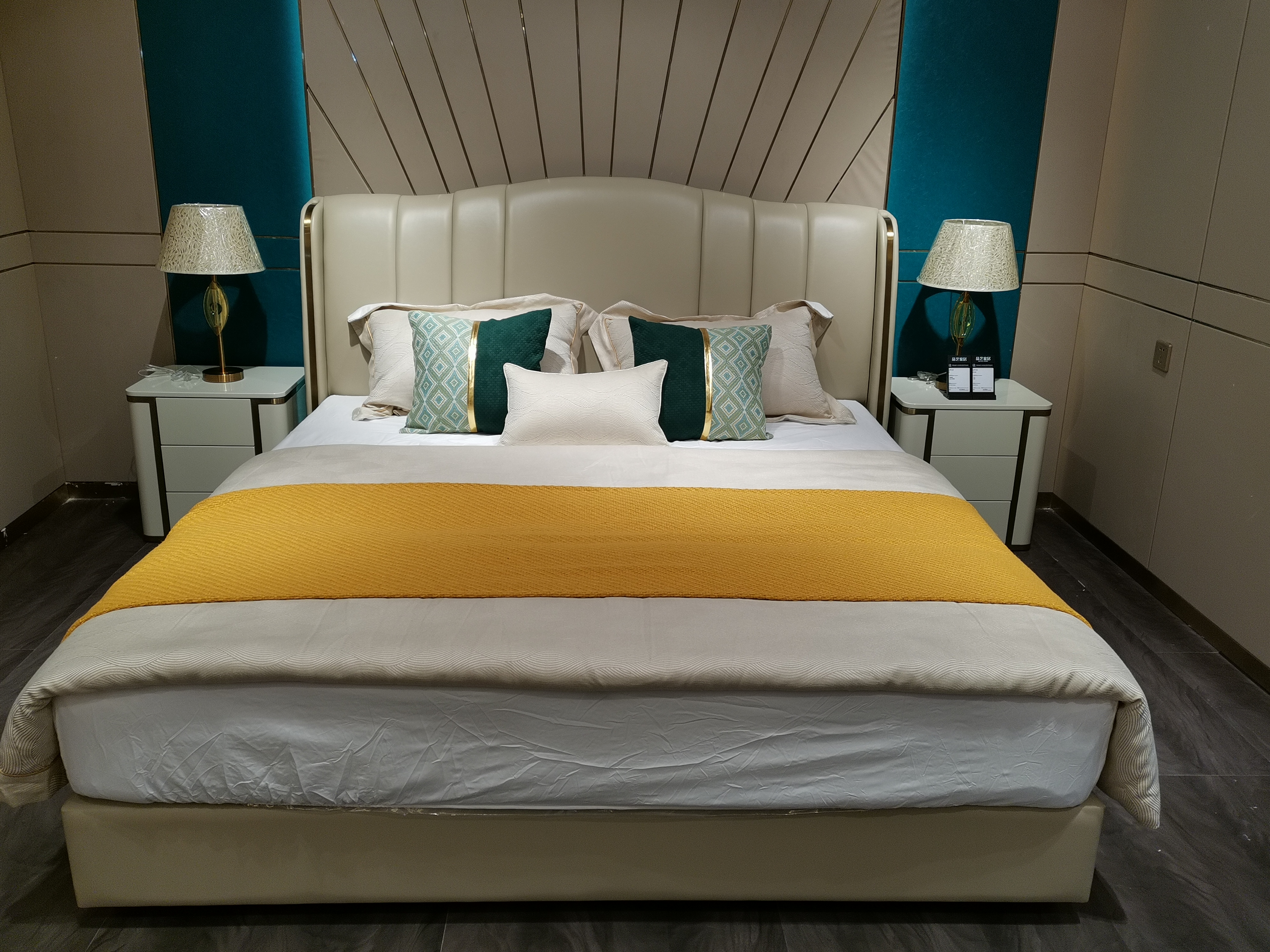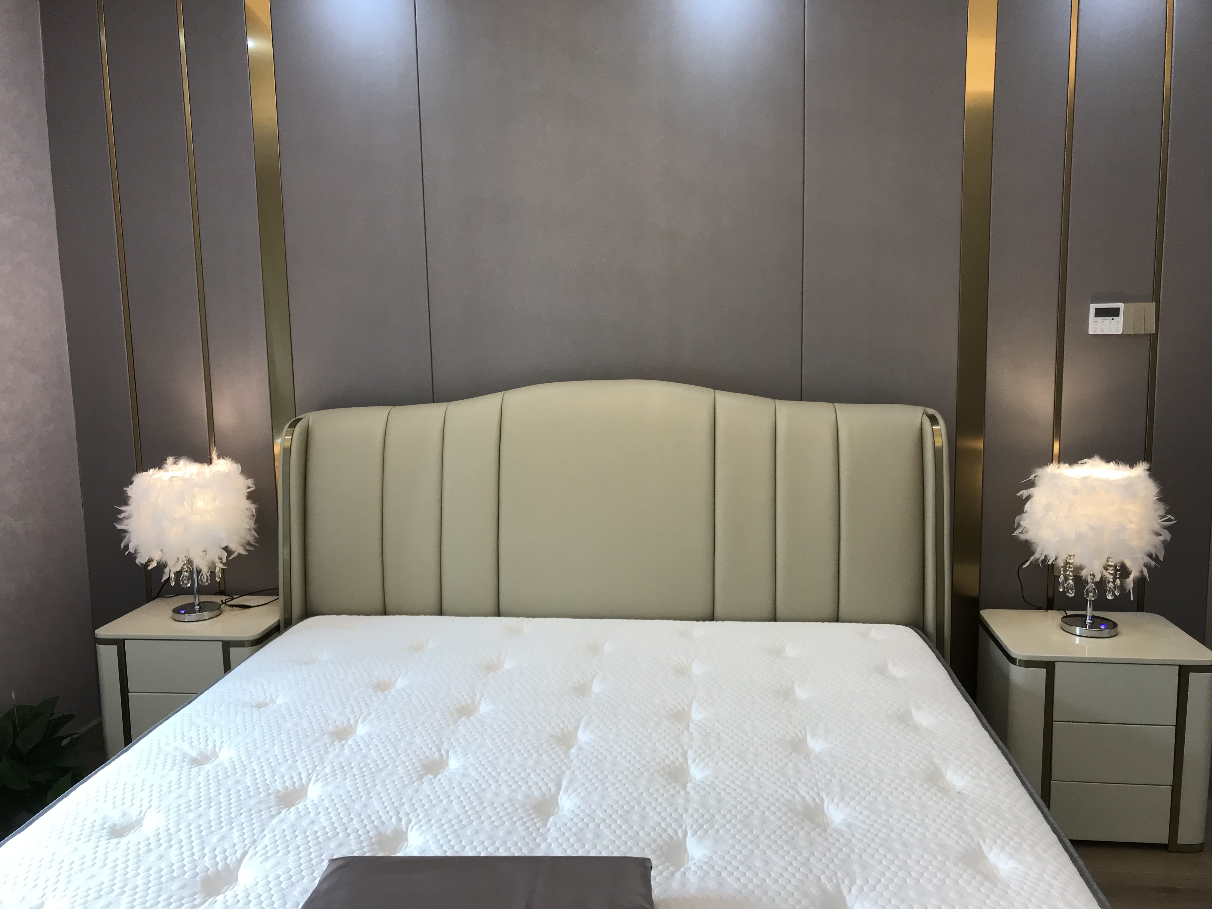 拜洛迪 轻奢 接触面真皮+五金拉丝香槟金不锈钢+床边实木+实木静音排骨架 米色 1.8米床| 商品详情 | 规格参数 | 评价(0) | 购买咨询() | 产品实拍图 |