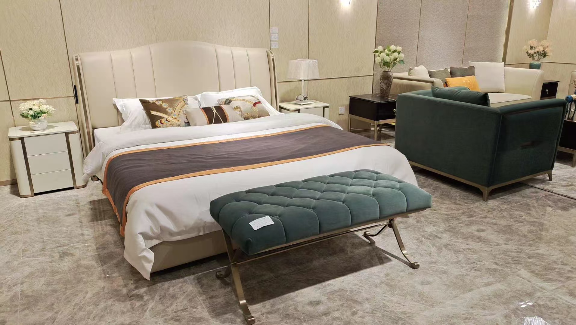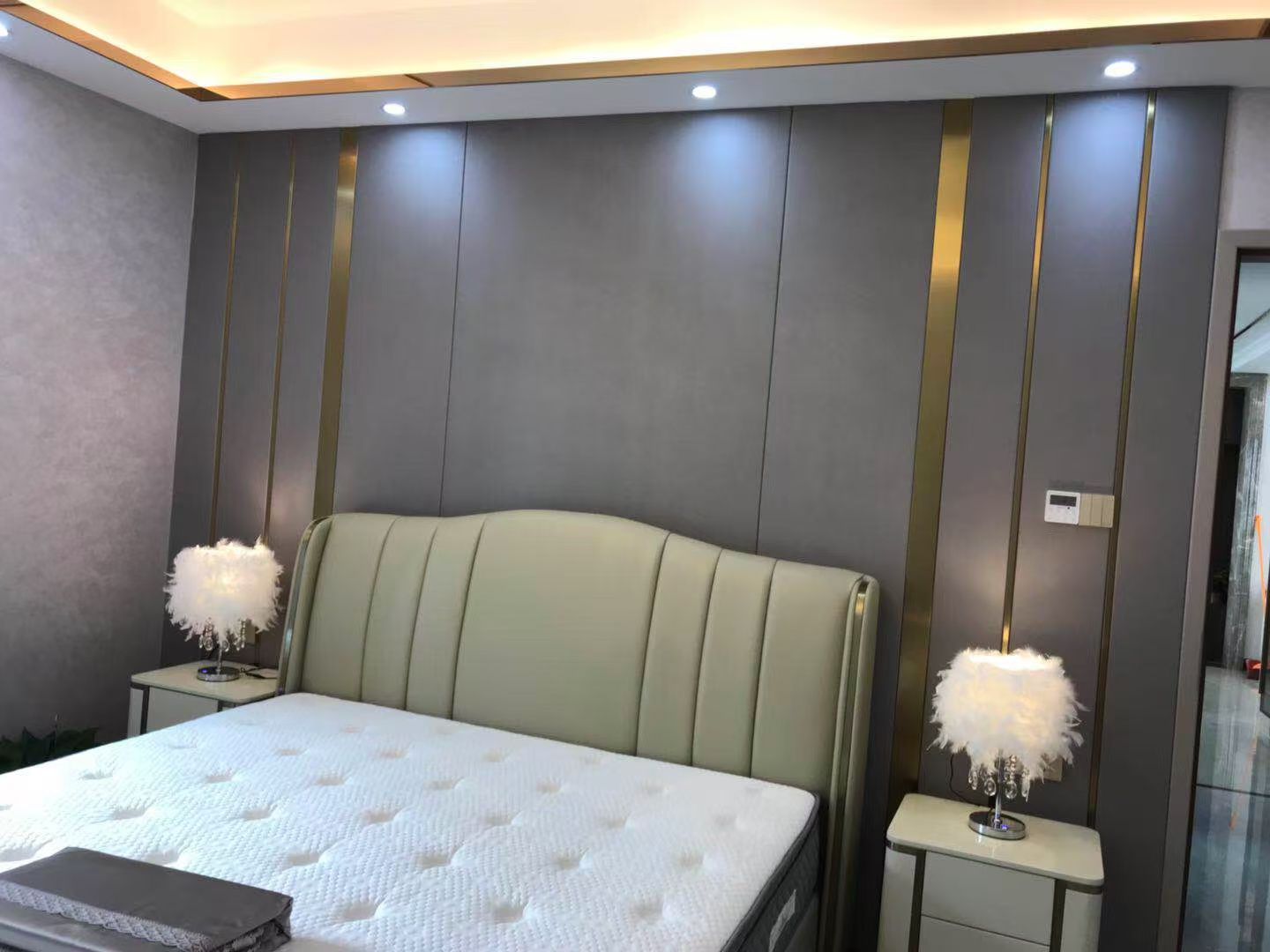 拜洛迪 轻奢 接触面真皮+拉丝香槟金不锈钢+实木排骨架+三边齐边 灰米黄色 1.8米床 |