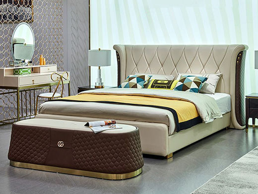 拜洛迪 轻奢 接触面真皮+拉丝香槟金不锈钢+实木排骨架+三边齐边 灰米黄色 1.8米床¥7831