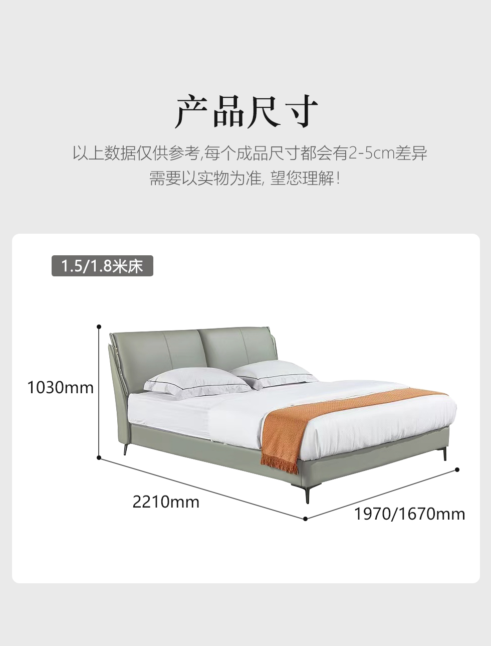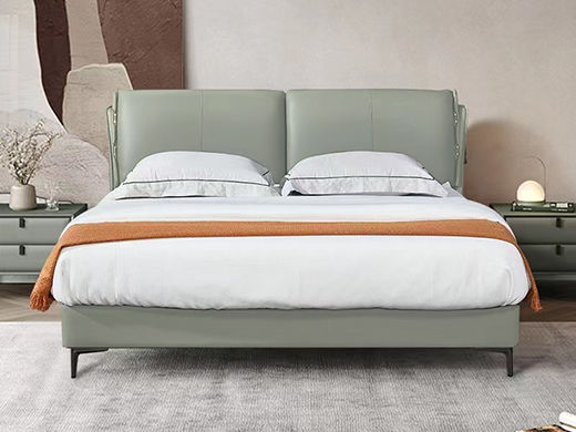 B系优选 现代简约 接触面真皮+仿皮+木框架高密 度回弹海绵+静音防滑实木十分排骨条+静音条 1.5米 真皮软床(价格不含高箱,如需定制请咨询客服)¥3728