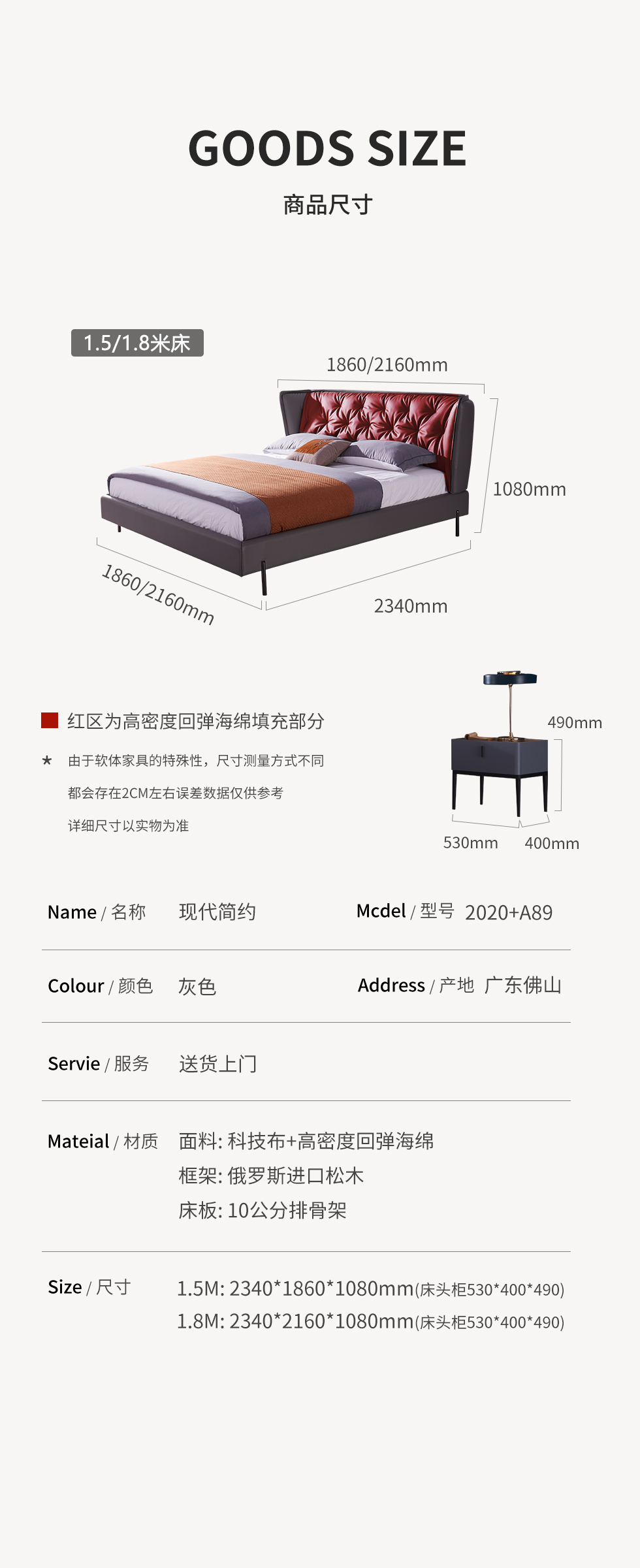B系优选 现代简约 科技布+俄罗斯进口松木+密度海绵+10公分排骨架+五金脚 灰色 1.8米软床+2个床头柜组合(价格不含高箱,如需定制请咨询客服)