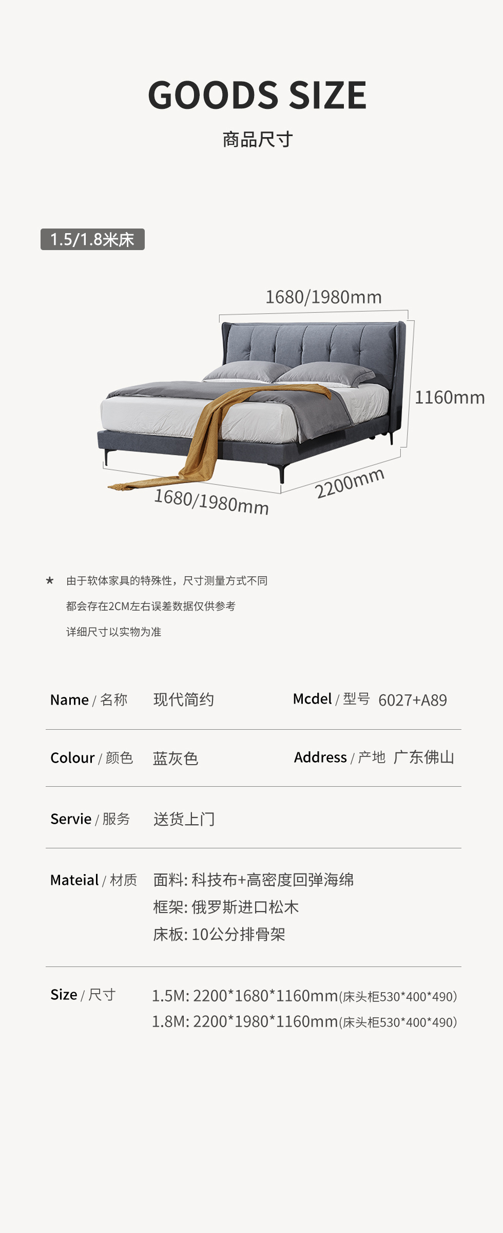 B系优选 现代简约 科技布+俄罗斯进口松木+密度海绵+10公分排骨架+五金脚 蓝灰色 1.8米软床(价格不含高箱,如需定制请咨询客服)
