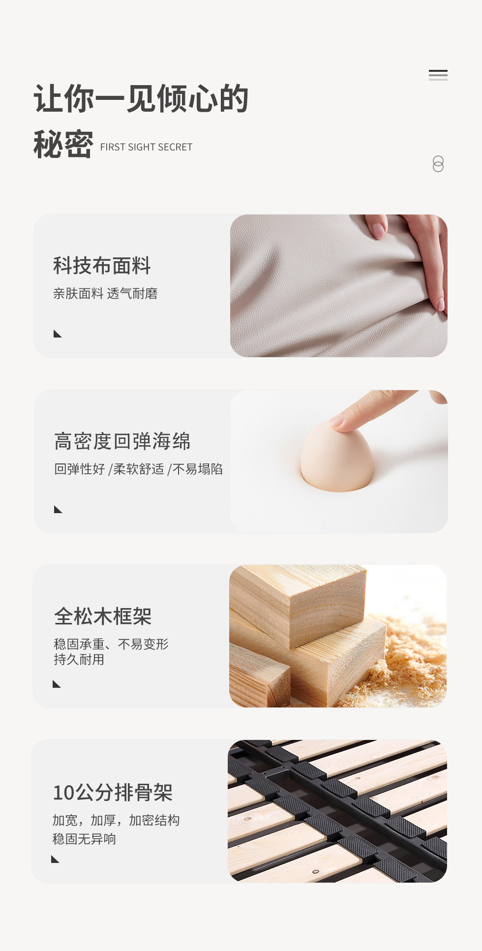 B系优选 现代简约 科技布+进口落叶松+多层实木板+高回弹海绵+碳素钢五金+10分钢木排骨架 米白 1.8米床(价格不含高箱,如需定制请咨询客服)¥4031