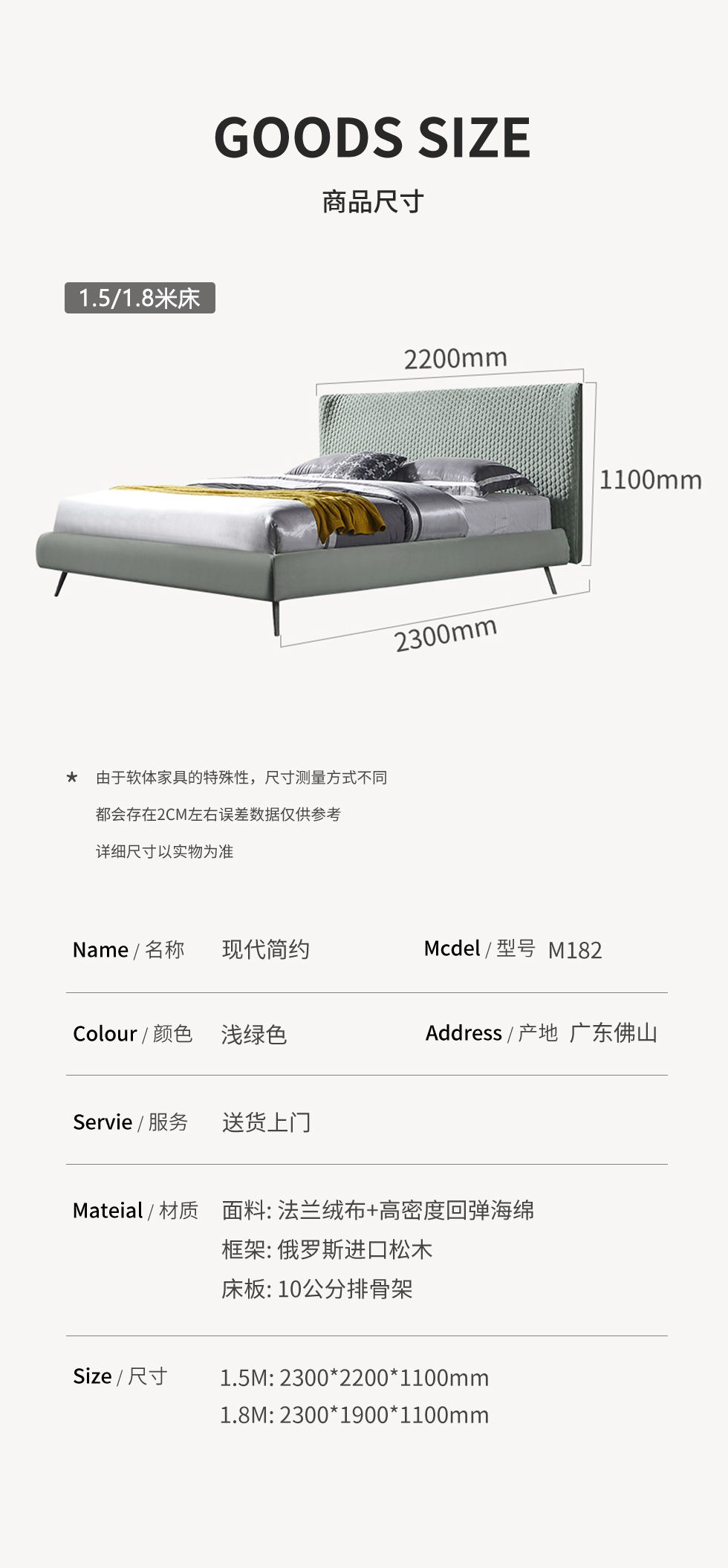 B系优选 极简 法兰绒布+俄罗斯进口松木+密度海绵+10公分排骨架+五金脚 浅绿色 1.8米软床(价格不含高箱,如需定制请咨询客服)