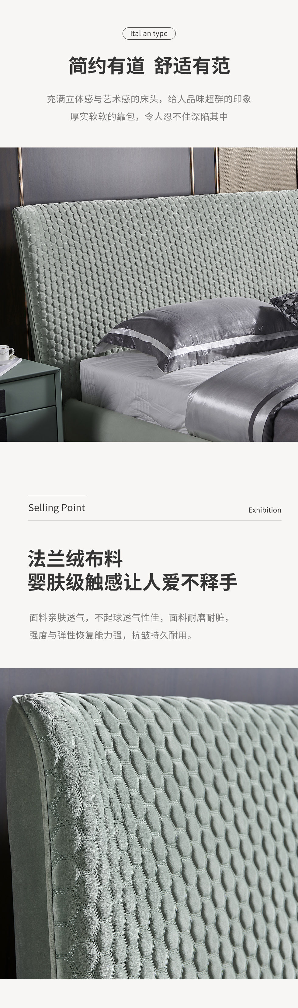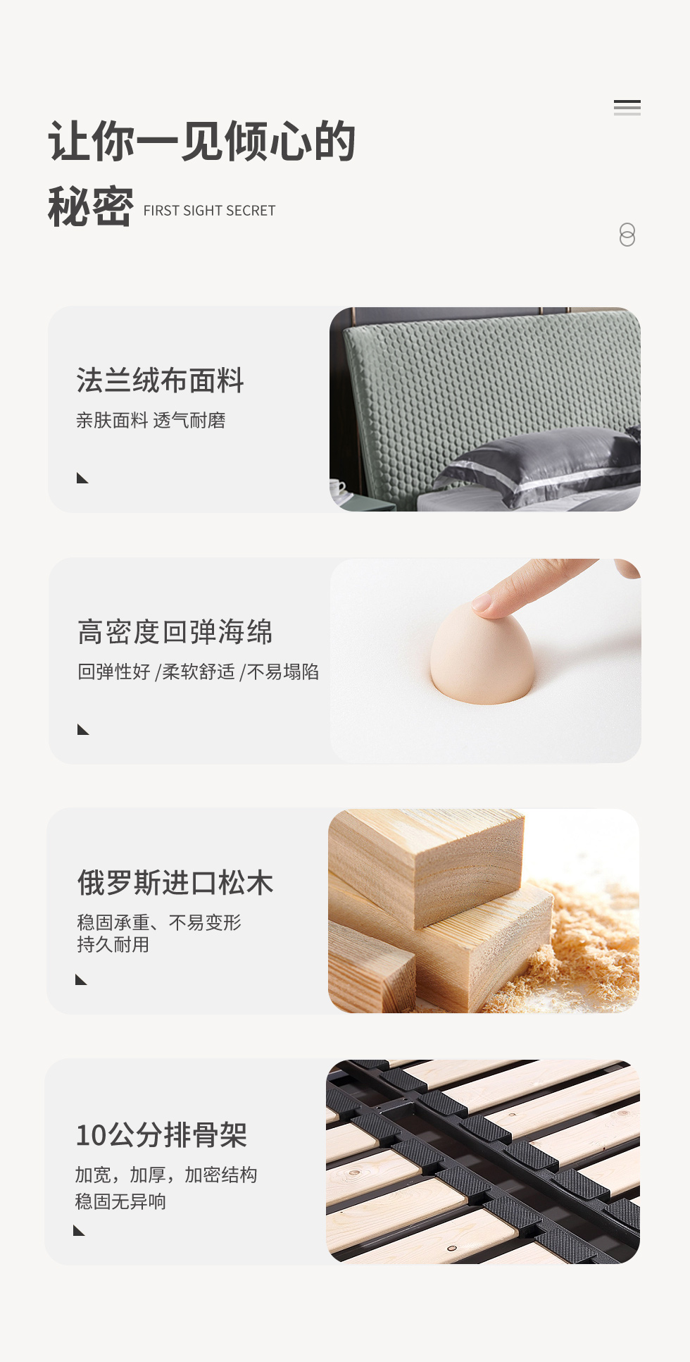 B系优选 极简 法兰绒布+ 俄罗斯进口松木+密度海绵+10公分排骨架+五金脚 浅绿色 1.5米软床+1个床头柜组合(价格不含高箱,如需定制请咨询客服)