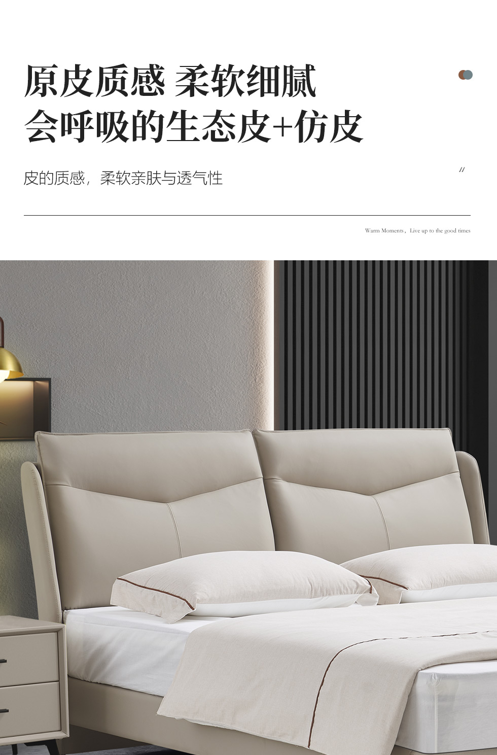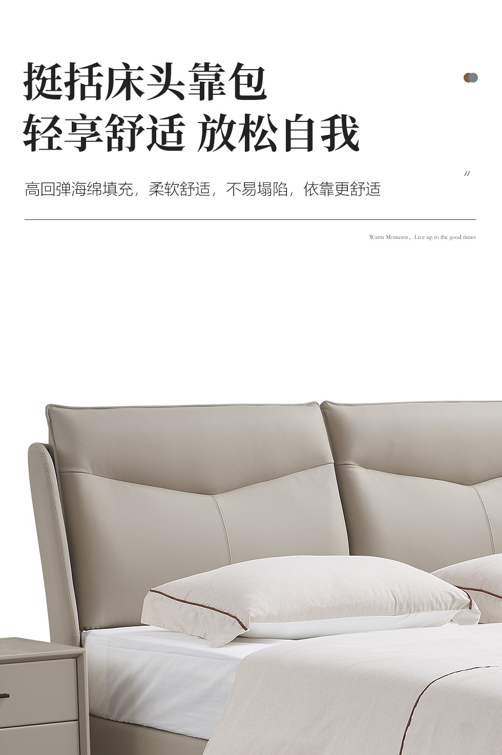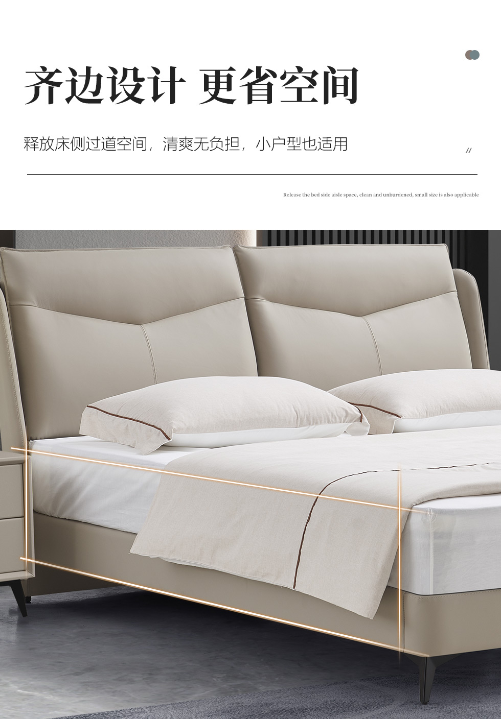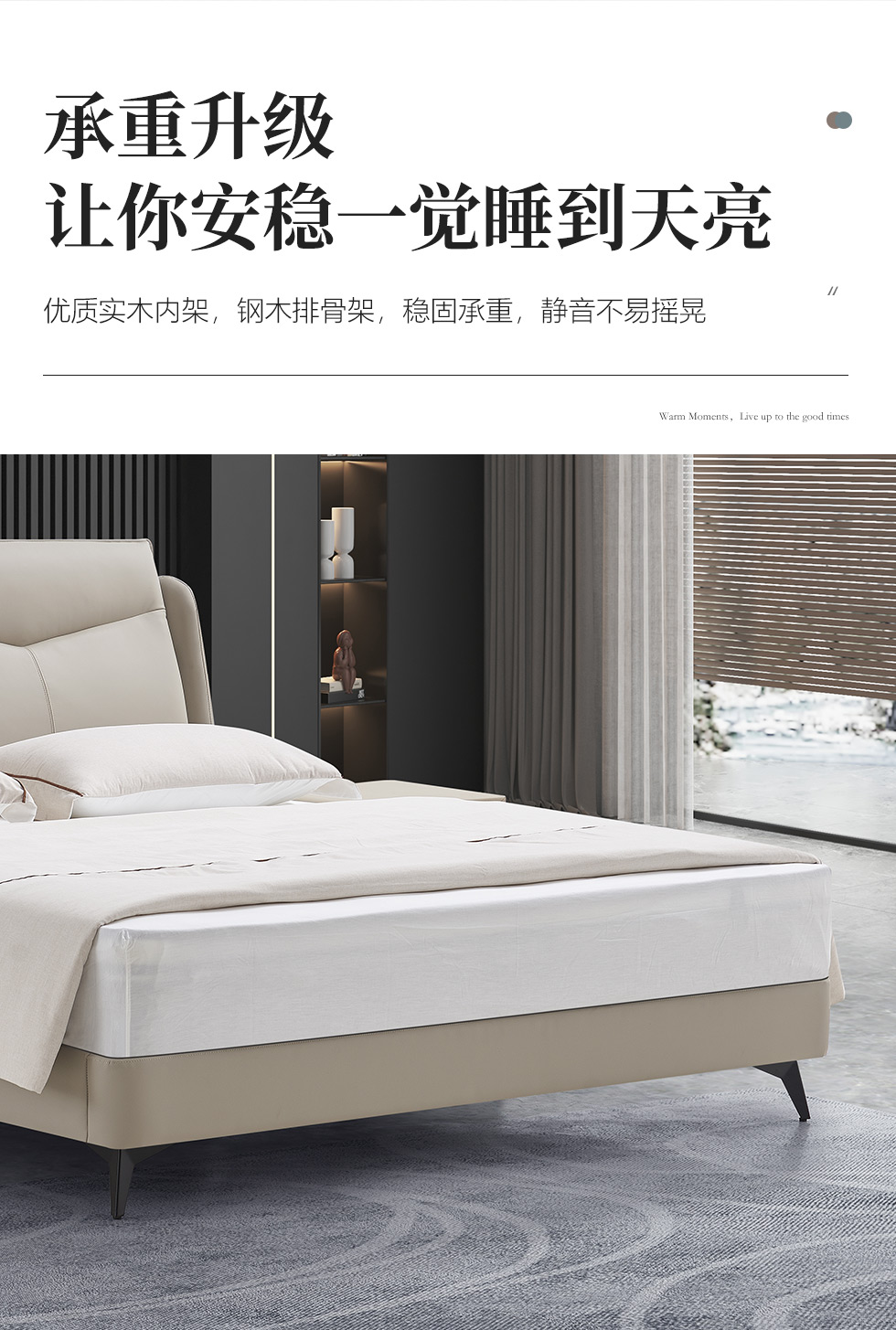 A系优选 极简 接触面头层真皮+进口落叶松+多层实木板+高回弹海绵+碳素钢五金+10分钢木排骨架 象牙白 1.8米床(价格不含高箱,如需定制请咨询客服)