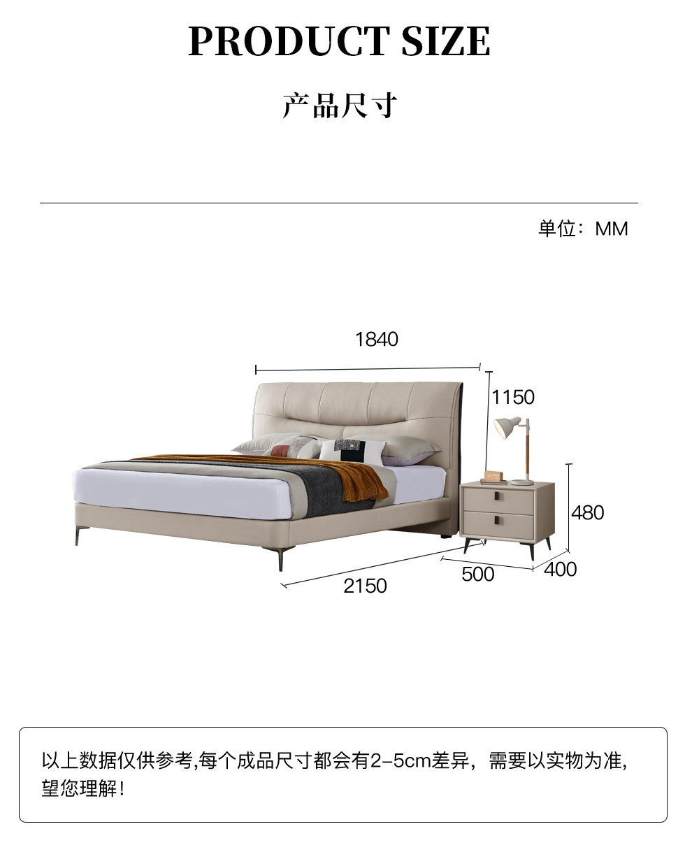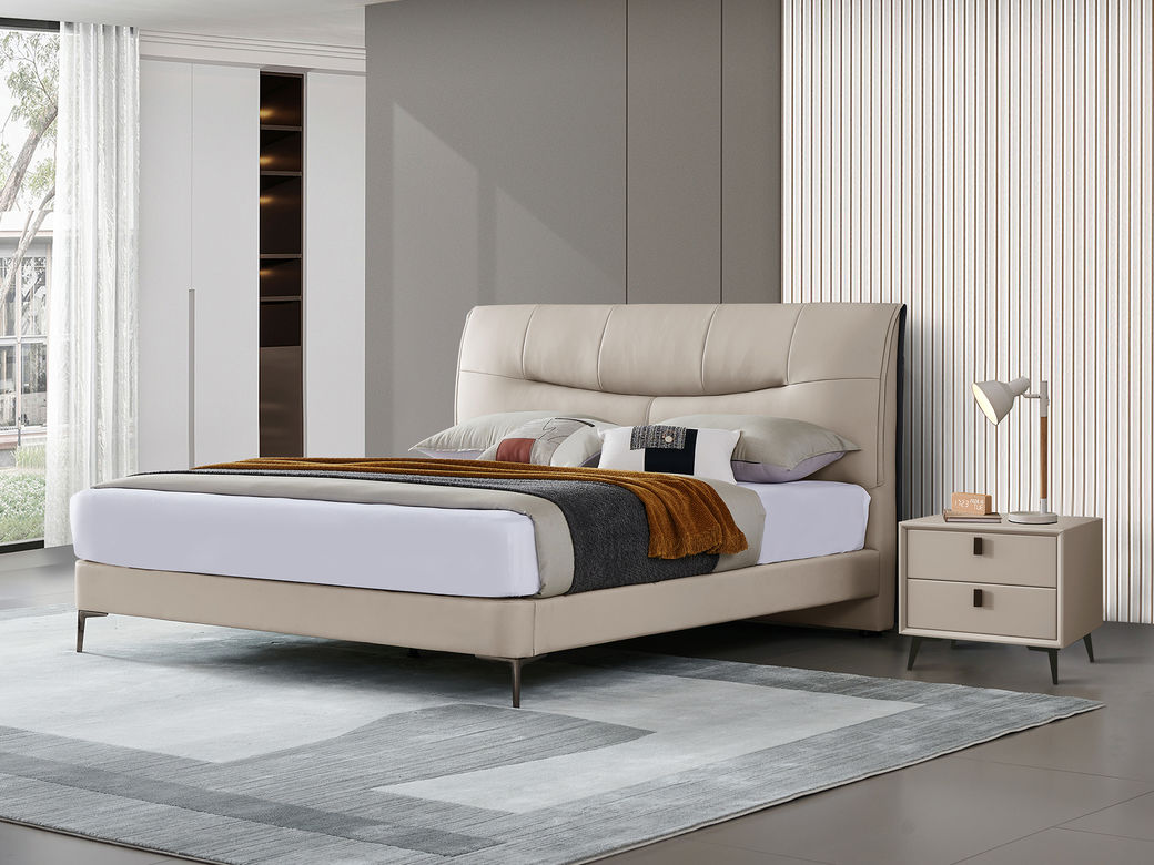 B系优选 现代简约 接触面真皮+高密度海绵+实木框架+钢木排骨架+碳素钢金属脚 1.8米软床+2个床头柜(价格不含高箱,如需定制请咨询客服)