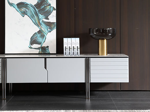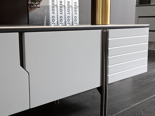 梵歌 现代简约 E1环保中纤板 三节滑珠导轨 6MM岩板石面 维多利亚灰 碳素钢五金架 浅灰白 电视柜
