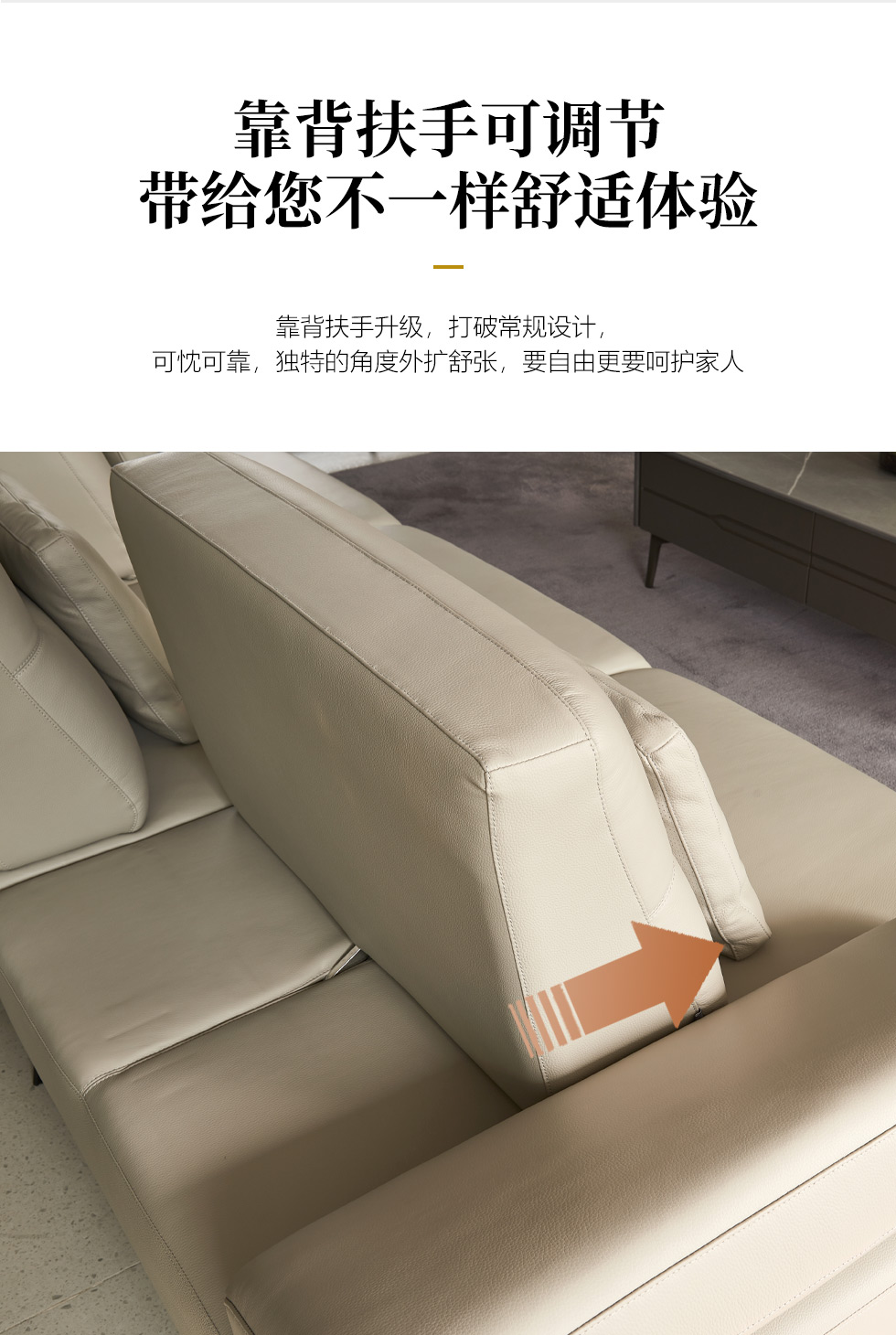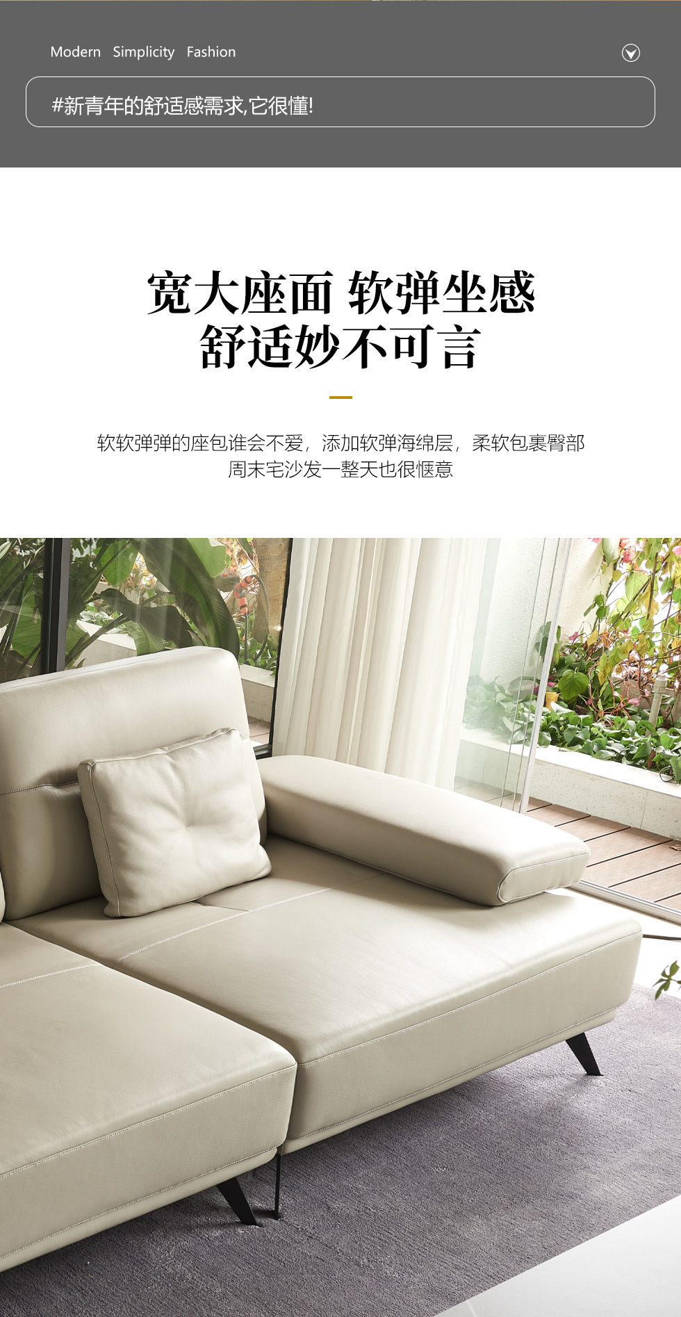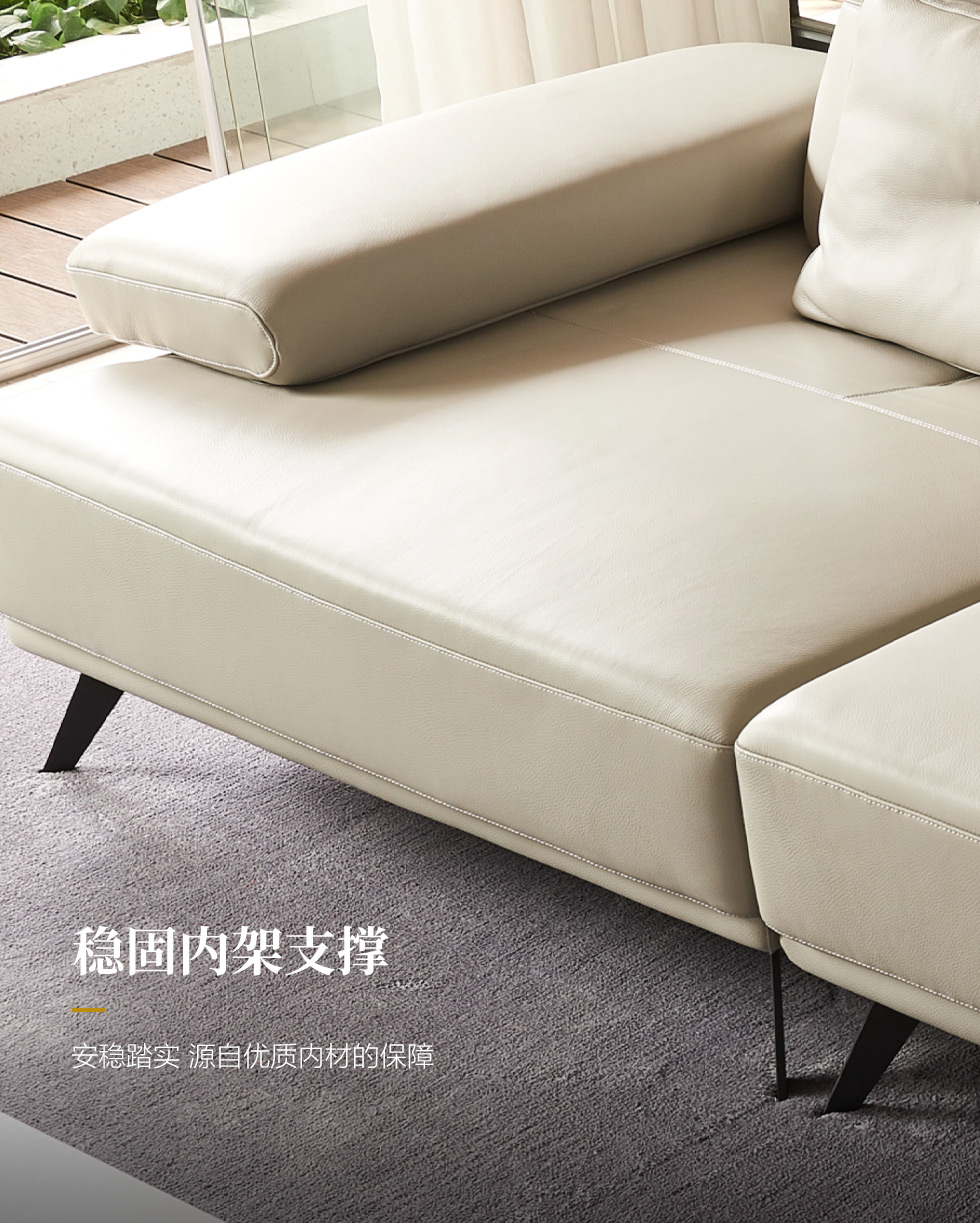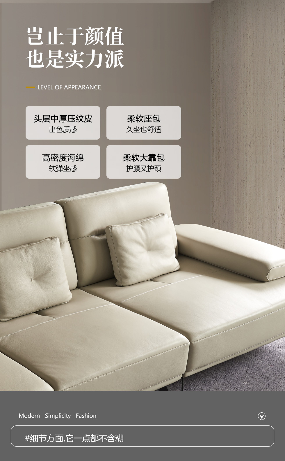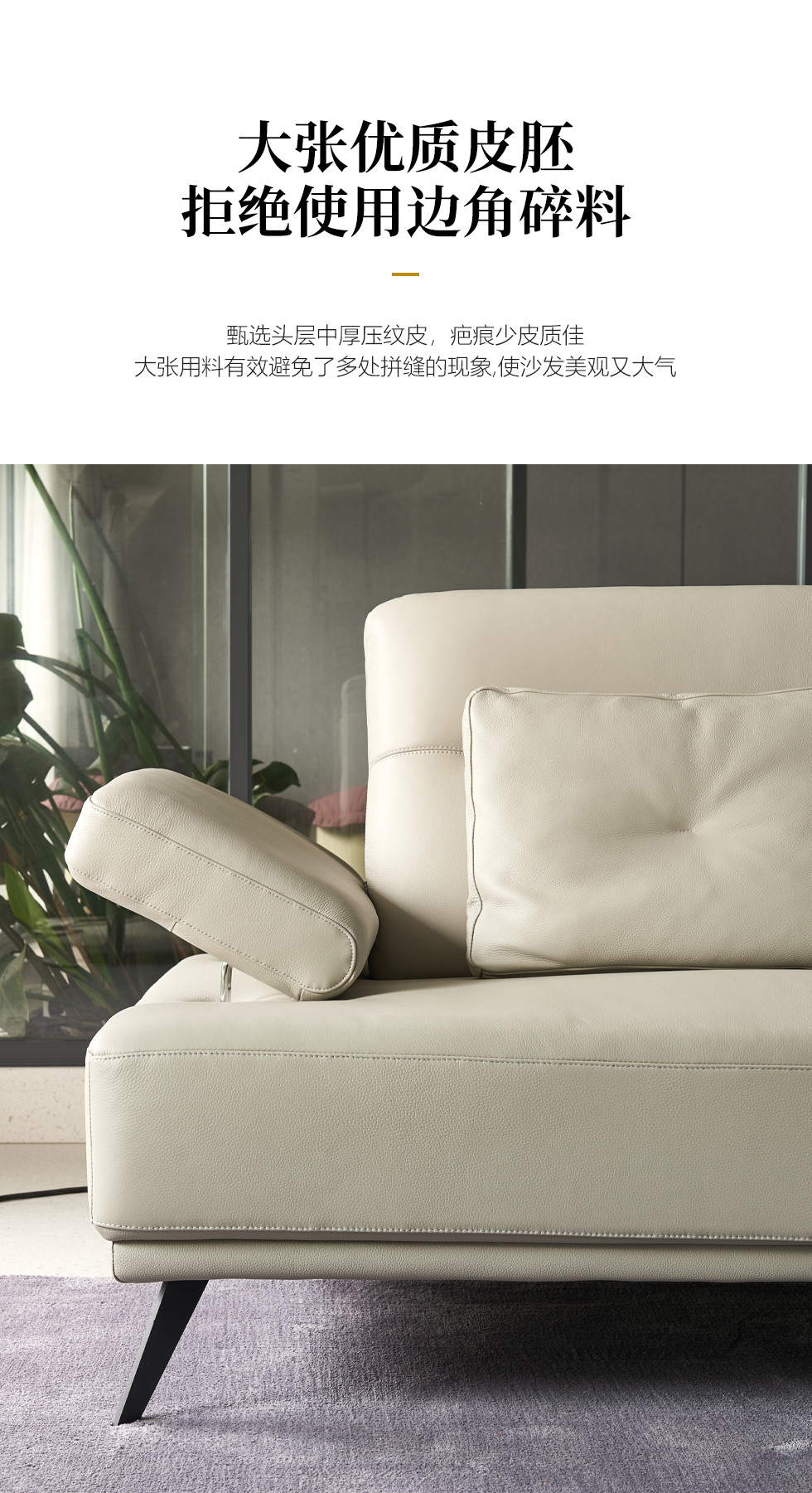 皇朝家居 现代极简 接触面轻压摔头层黄牛皮 +桉木足方+E1双面杨木夹板 Φ4.0拱簧+高回弹海绵+白鹅绒+公仔棉+五金脚 三人位 3.065米沙发