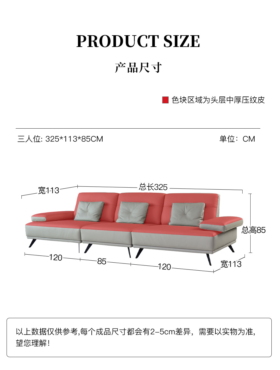 希奥 极简 头层牛皮 俄罗斯樟子松 双扶三位 半皮(接触面真皮)2.4米沙发