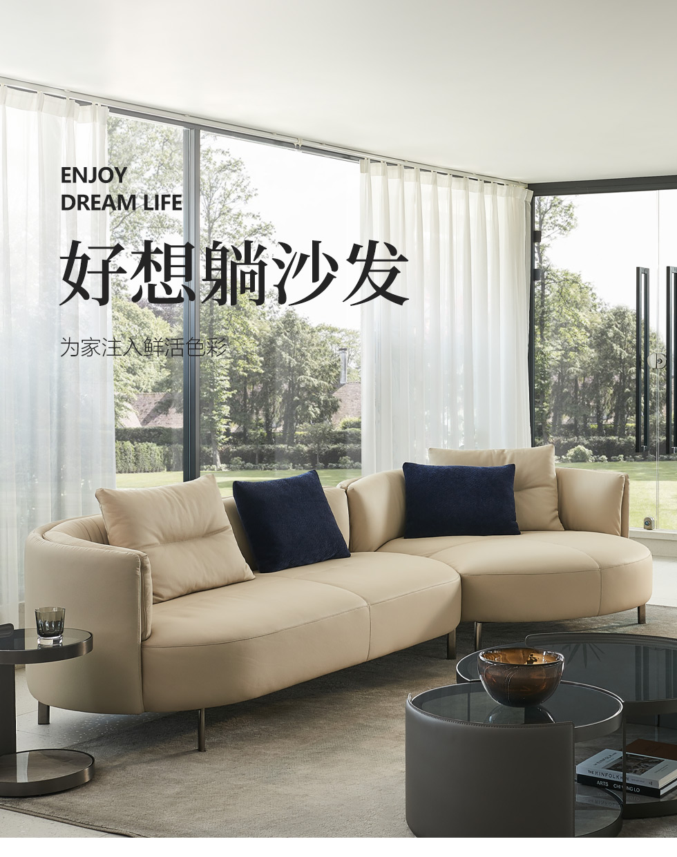 缔造 极简 接触面进口意大利头层真皮+羽丝棉+高密度海棉+碳素钢脚+北美白蜡木(做碳灰木色)真皮转角3.4米沙发 (扶手边 左1+无1+右贵)¥9702