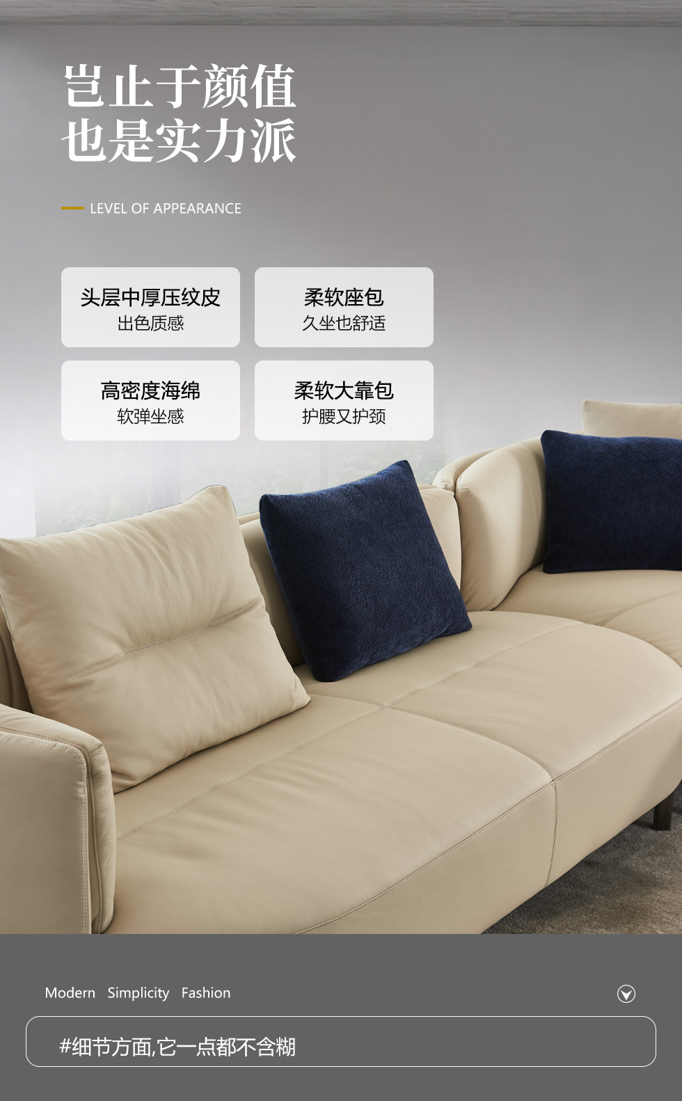 梵纳意简 极简 接触面头层牛皮+多层实木板+实木框架+高回弹海绵+碳素钢五金+羽绒 右转角沙发 网红 极简罗杰4.2米沙发| 商品详情 | 规格参数 | 评价(0) | 购买咨询() | 产品实拍图 |
