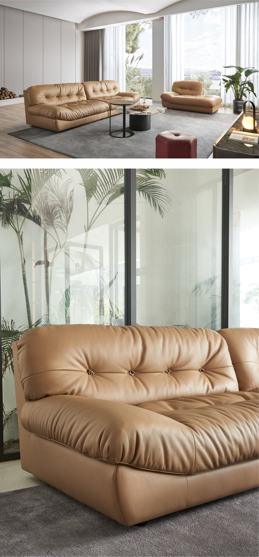 希奥 极简 海绵40-45密度+接触面羽绒真皮+中厚压纹皮+金属脚米黄色皮艺转角3.37米沙发(3人位+左贵妃)¥19217