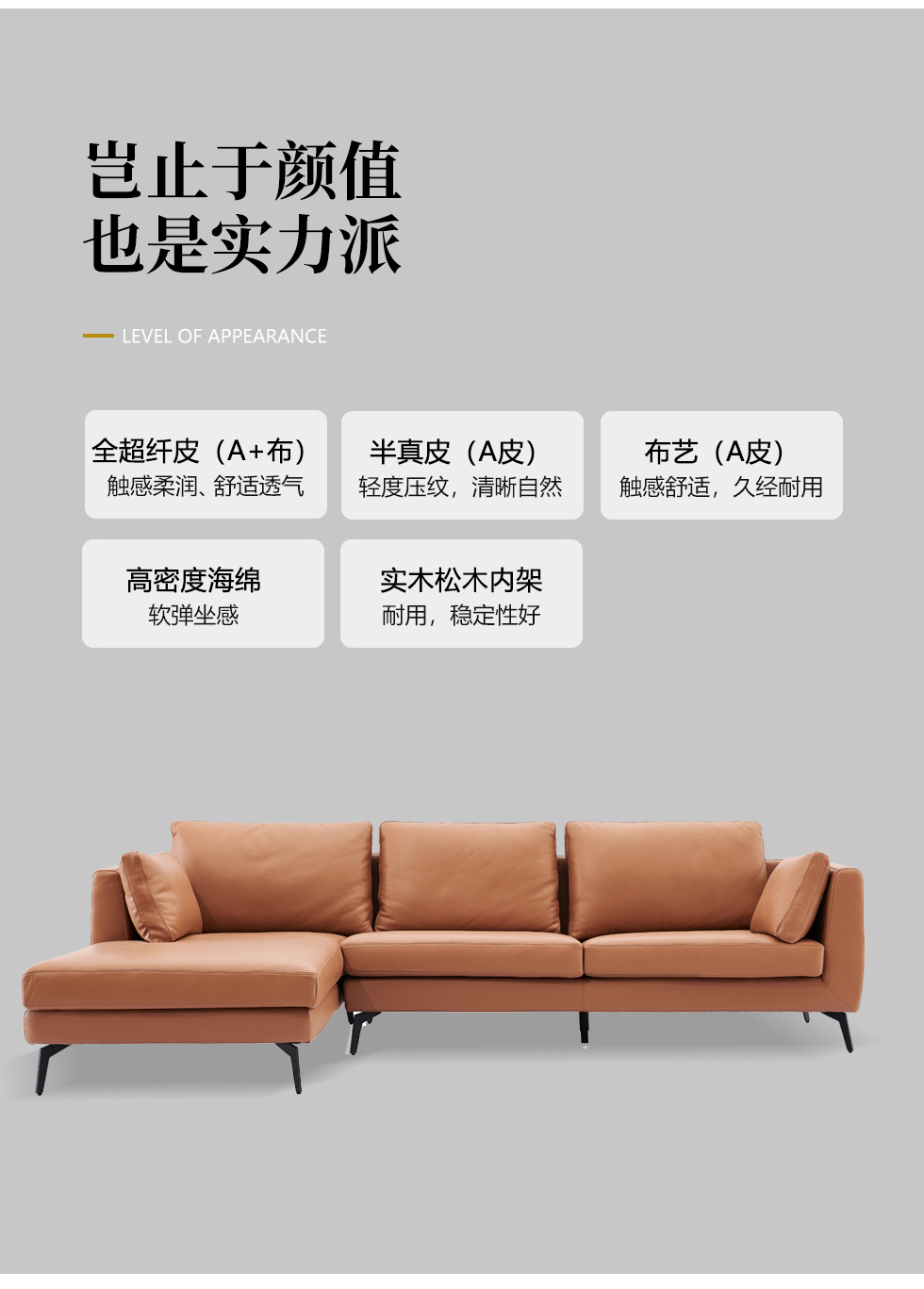 希奥 极简 进口磨砂皮 俄罗斯樟子松 3+左贵妃 网红地平线 皮转角3.65米沙发Milos米洛斯 极简 半真皮(A皮)+高回弹海绵+羽绒+实木松木内架+碳素钢金属烤漆框架 皮艺3.05米沙发 (单扶三+单扶单)