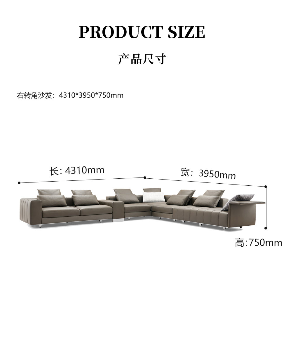 Milos米洛斯 极简 半真皮(A皮)+高回弹海绵+羽绒+实木松木内架+不锈钢拉丝底架 钢琴键网红 皮艺转角4.31米沙发 (单扶三*2+活动扶手+无扶单+右贵妃)