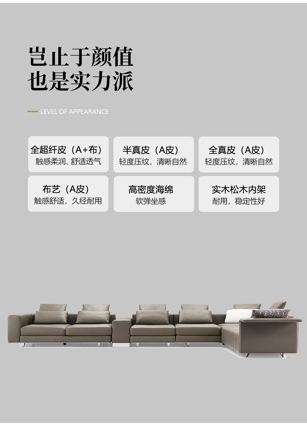希奥 极简 进口磨砂皮 俄罗斯樟子松 3+左贵妃 网红地平线 皮转角3.65米沙发Milos米洛斯 极简 半真皮(A皮)+高回弹海绵+羽绒+实木松木内架+碳素钢金属烤漆框架 皮艺3.05米沙发 (单扶三+单扶单)