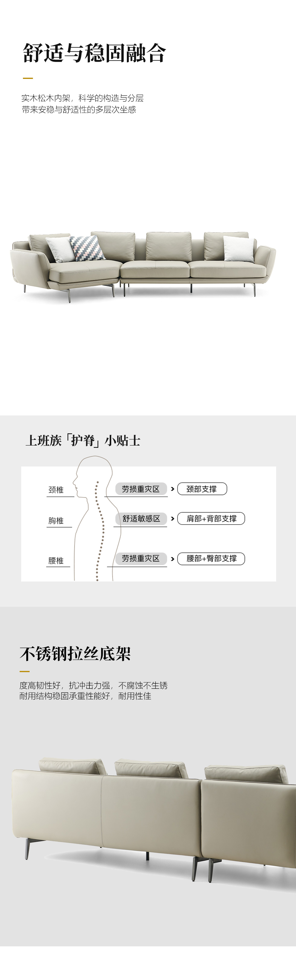 Milos米洛斯 极简 半真皮(A皮)+高回弹海绵+羽绒+实木松木内架+不锈钢拉丝脚 皮艺转角3.7米沙发 (3+左贵) |