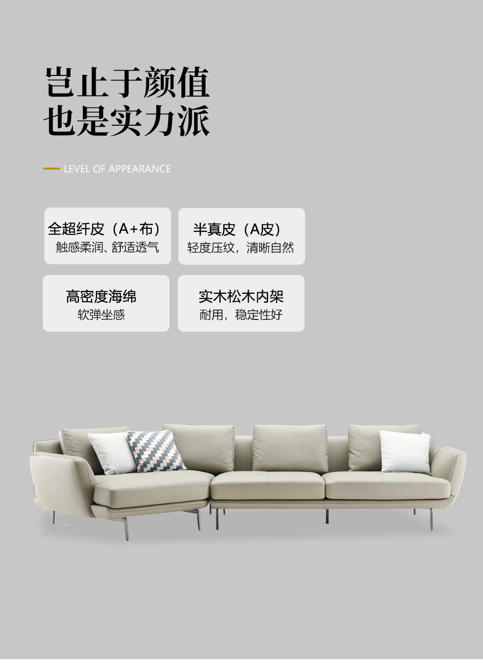 希奥 极简 进口磨砂皮 俄罗斯樟子松 3+左贵妃 网红地平线 皮转角3.65米沙发Milos米洛斯 极简 半真皮(A皮)+高回弹海绵+羽绒+实木松木内架+碳素钢金属烤漆框架 皮艺3.05米沙发 (单扶三+单扶单)