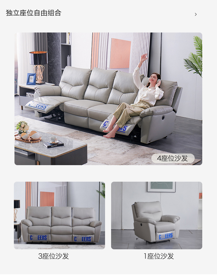 芝华仕 现代简约 接触面进口头层奶牛皮+PVC+合金钢架+进口实木+多层实木板+合金刚架脚+塑胶防刮胶套+太空绵+高回弹海绵 三人位【双电机】功能皮艺2.6米沙发