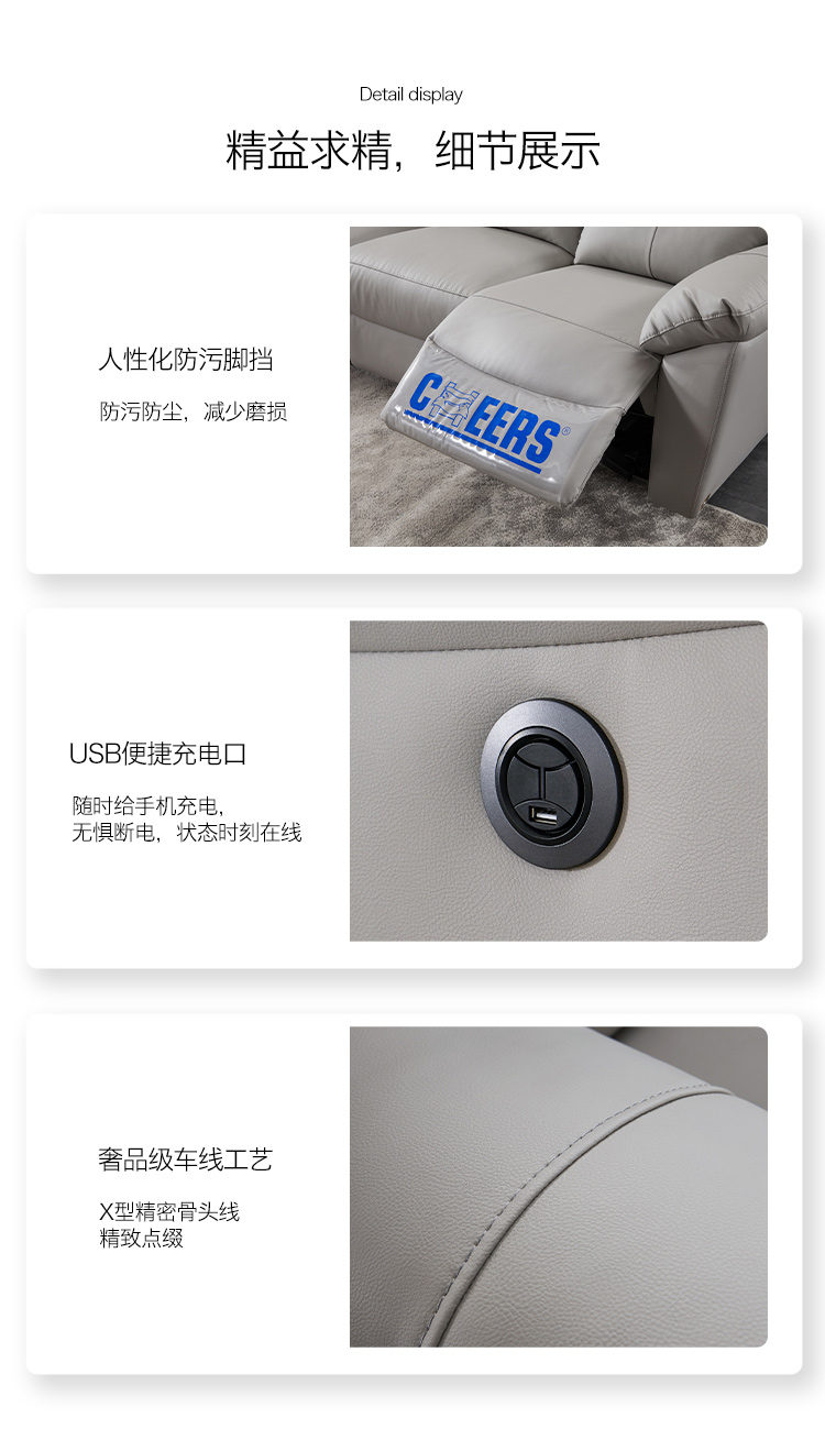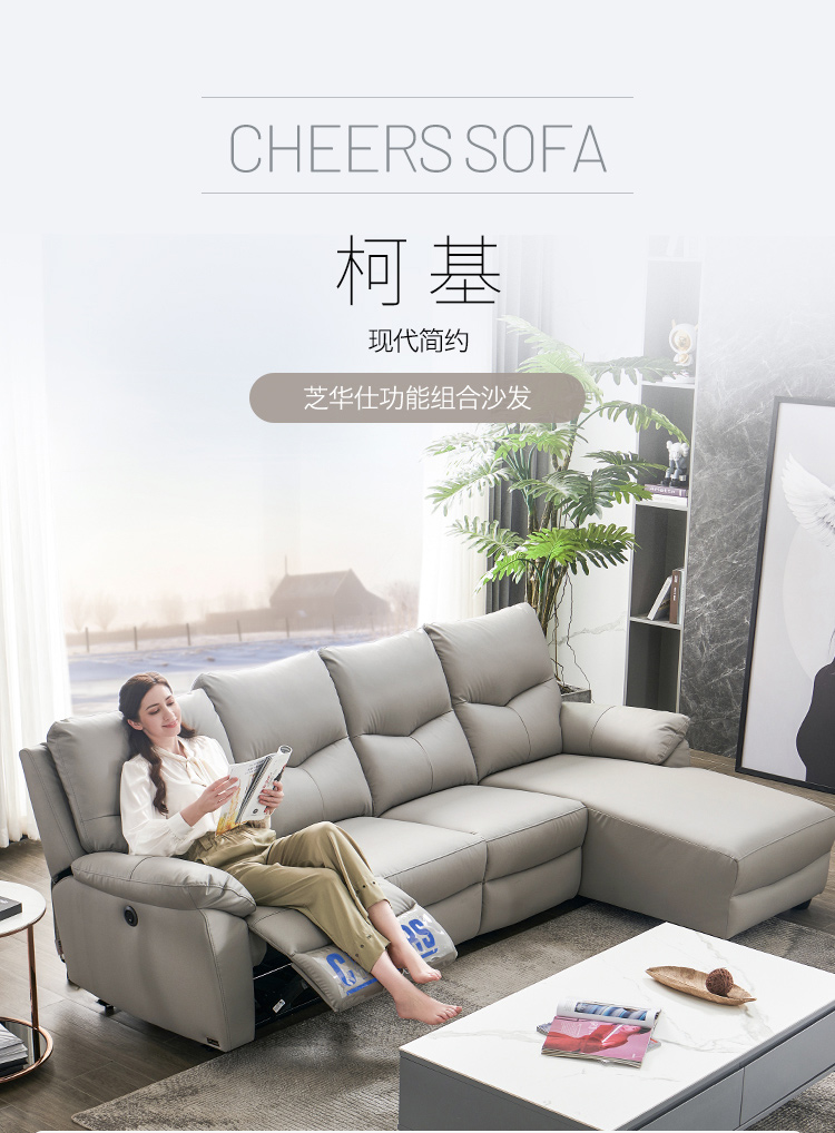芝华仕 现代简约 接触面进口头层奶牛皮+PVC+合金钢架+进口实木+多层实木板+合金刚架脚+塑胶防刮胶套+太空绵+高回弹海绵 三人位【双电机】功能皮艺2.6米沙发