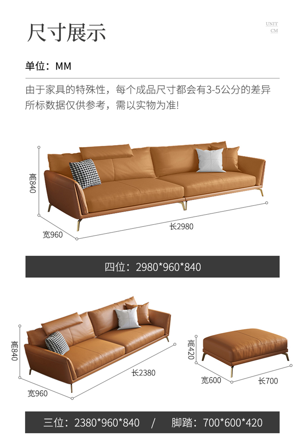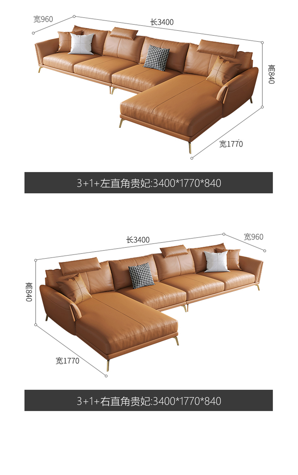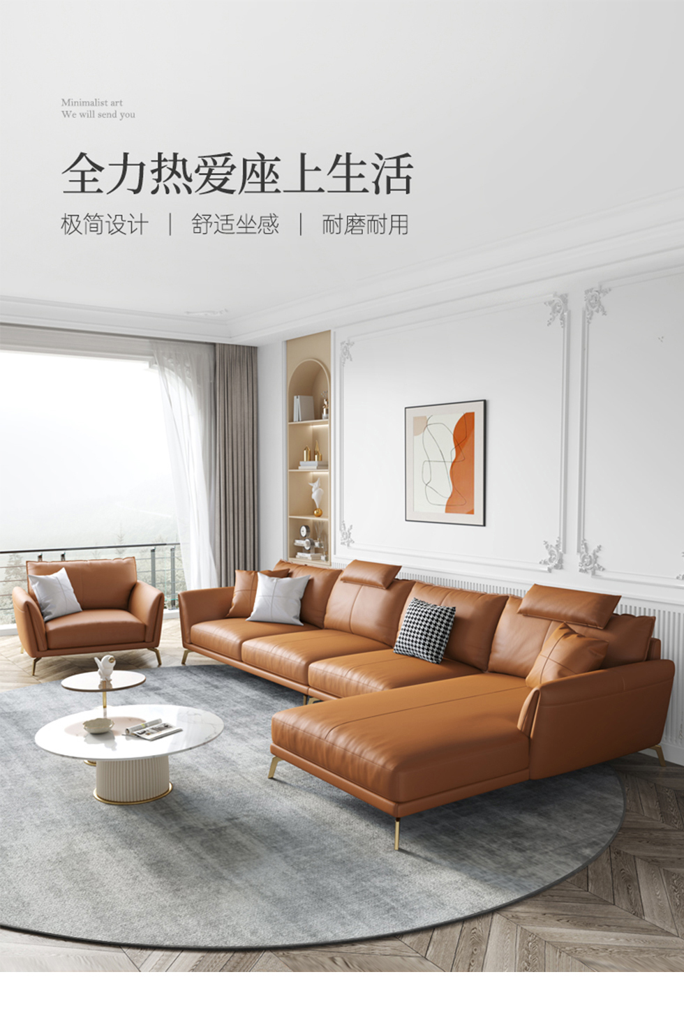 非凡工艺 现代简约 组合沙发 科技布+东亚大豆纤维海绵+俄罗斯樟子松+碳素钢五金脚 橙色非凡工艺 现代简约 接触面头层牛皮+优质回弹海绵+框架落叶松木+绒丝棉+多层实木夹板+5cm黑砂五金脚 左单+右三 2.8米 4人位 沙发