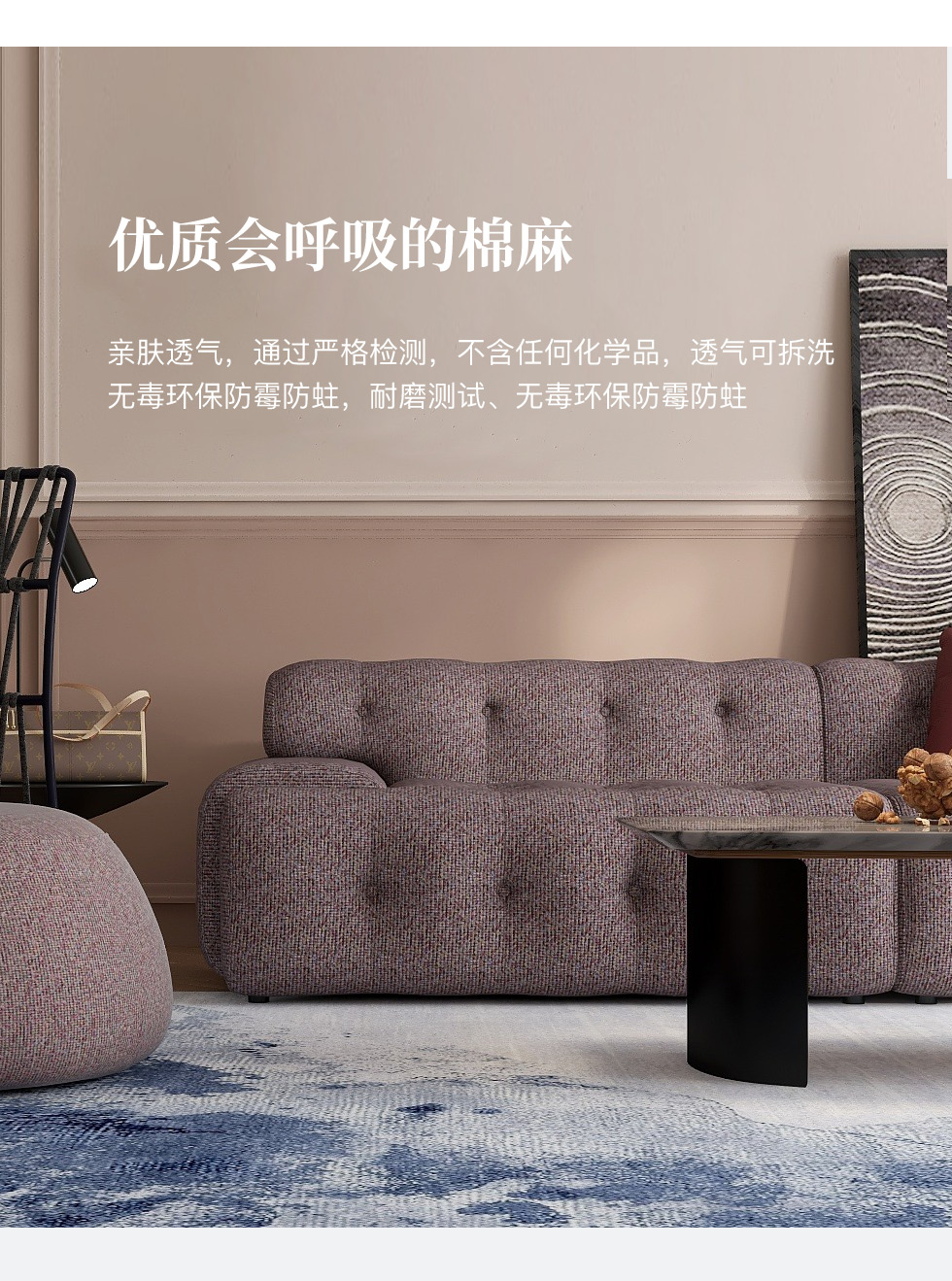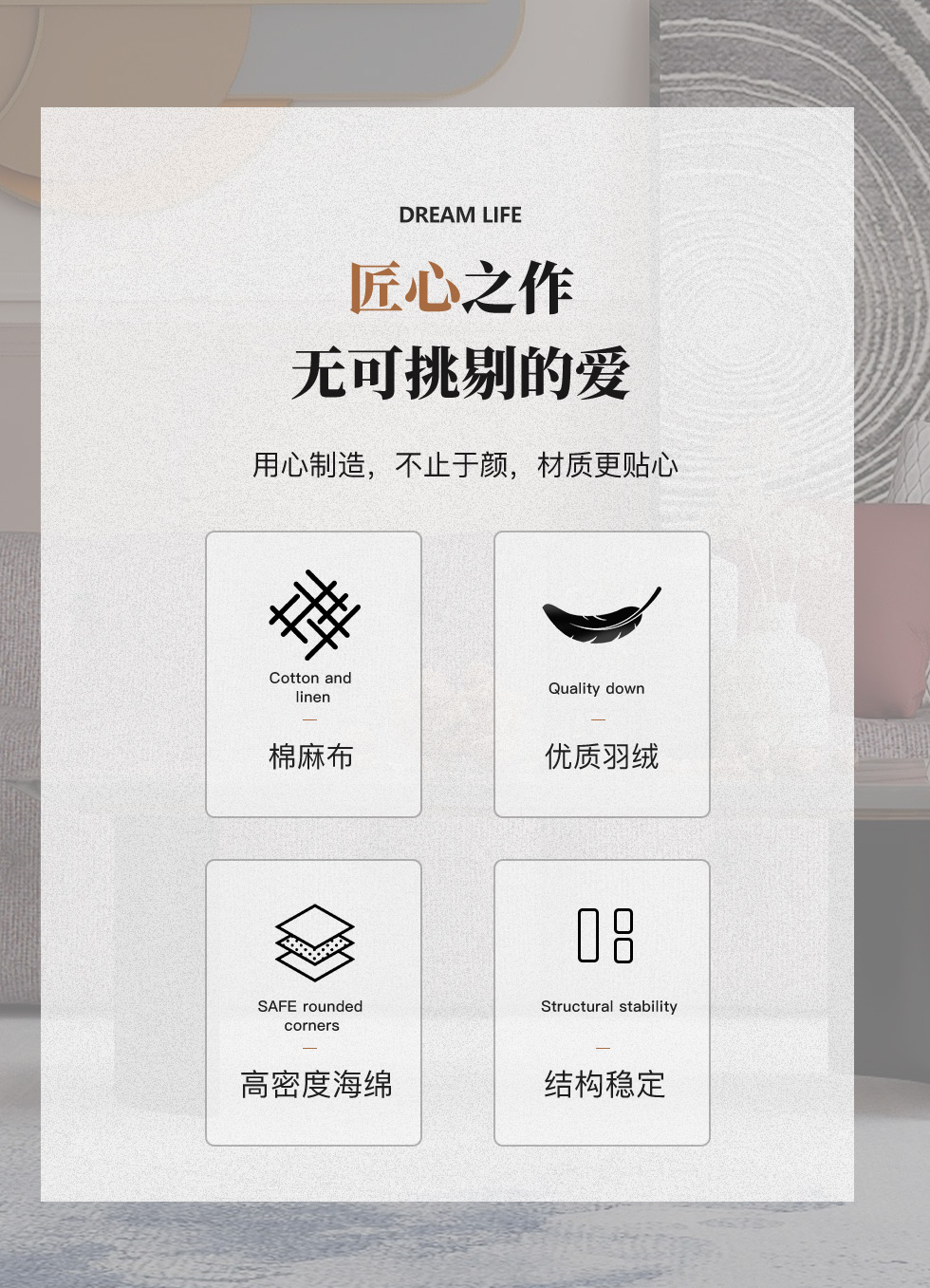 缔造 极简 优质棉麻布+羽绒+高密度海棉+碳素钢脚+北美白蜡木(做碳灰木色)边框+铁片包马铵硬皮 布艺沙发 四人位2.44米沙发¥20012